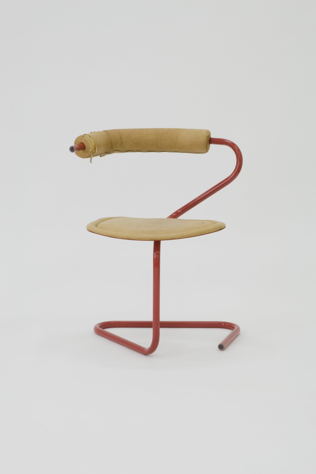 ユニークな形のフレームワークで構成された椅子で、素材はスチールパイプである。座は1本のスチールパイプに、スチール板をかなり強力に溶接して取り付けている。それをベースとし、内部にウレタンを用いた革張りのパッドが張られている。背とアームを兼ねた部分はパイプにウレタンを巻き、その上に革を巻き付けている。その下部にはファスナーが付いていて取り外し可能にしている。非対称の座の形といい、アームおよび細部の処理といい造形的優位性を考えた椅子といえる。ステファン・ヴェヴェルカは新しい発想によって、数多くの個性的な椅子を発表している。