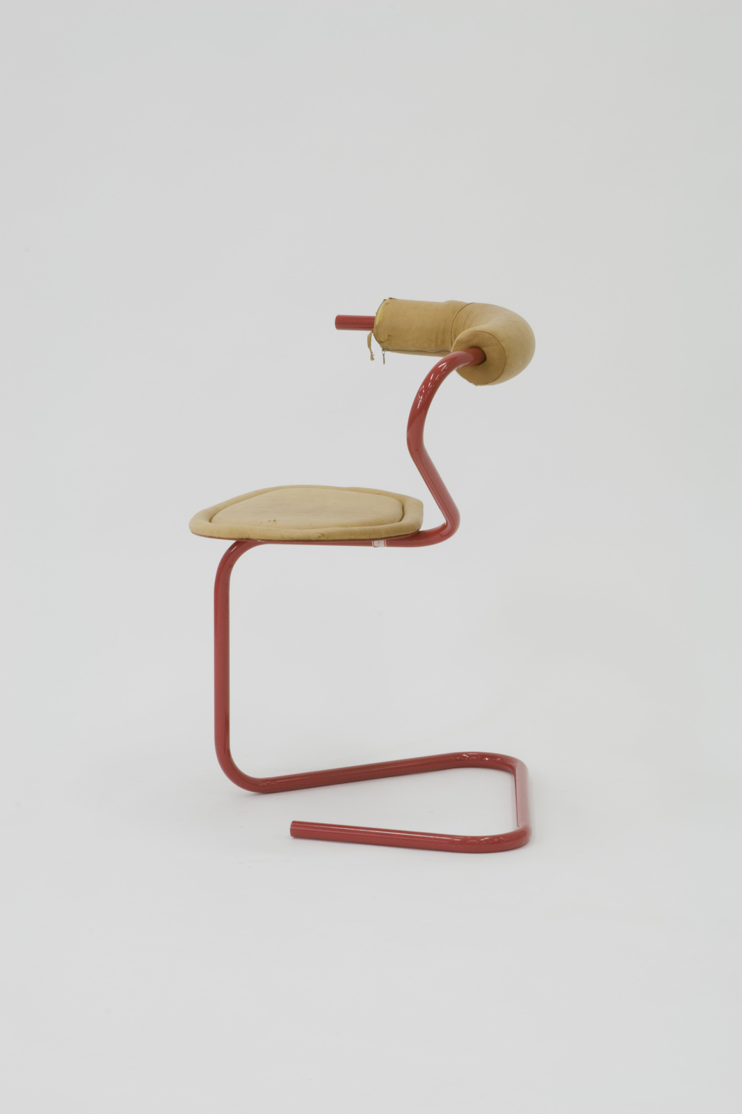 ユニークな形のフレームワークで構成された椅子で、素材はスチールパイプである。座は1本のスチールパイプに、スチール板をかなり強力に溶接して取り付けている。それをベースとし、内部にウレタンを用いた革張りのパッドが張られている。背とアームを兼ねた部分はパイプにウレタンを巻き、その上に革を巻き付けている。その下部にはファスナーが付いていて取り外し可能にしている。非対称の座の形といい、アームおよび細部の処理といい造形的優位性を考えた椅子といえる。ステファン・ヴェヴェルカは新しい発想によって、数多くの個性的な椅子を発表している。