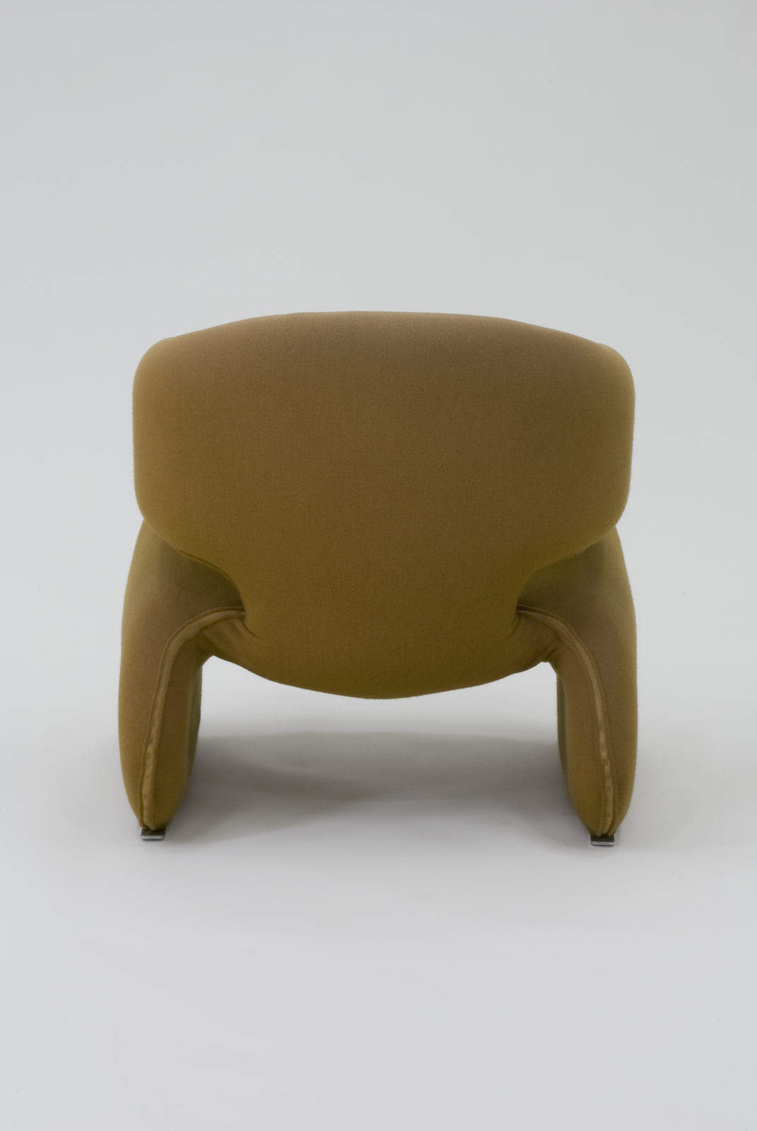 1965年に発表されたこの椅子は、世界的に衝撃を与えた。旧来の椅子の概念を大きく変えて、自由な曲線によるフォルムでつくりあげたエポックメーキングな椅子の出現であった。技術的には金属で構造体をつくり、座にはゴムのウェービングを張ったのち、クッション材のウレタンで包み、収縮性のあるニット地で全体をくるみ、ファスナーでとめるという構造である。何種類かの色彩の布による張り替えが可能である。椅子の構造体を見せずに曲線的なフォルムで、また張り生地が交換できるという新しいデザインである。 |