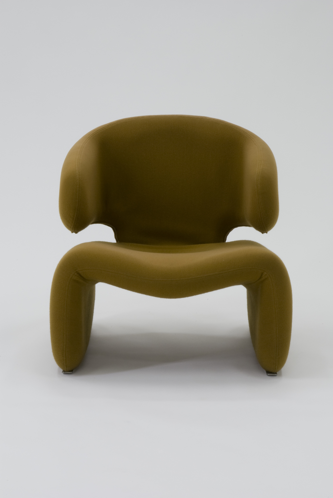 1965年に発表されたこの椅子は、世界的に衝撃を与えた。旧来の椅子の概念を大きく変えて、自由な曲線によるフォルムでつくりあげたエポックメーキングな椅子の出現であった。技術的には金属で構造体をつくり、座にはゴムのウェービングを張ったのち、クッション材のウレタンで包み、収縮性のあるニット地で全体をくるみ、ファスナーでとめるという構造である。何種類かの色彩の布による張り替えが可能である。椅子の構造体を見せずに曲線的なフォルムで、また張り生地が交換できるという新しいデザインである。 |