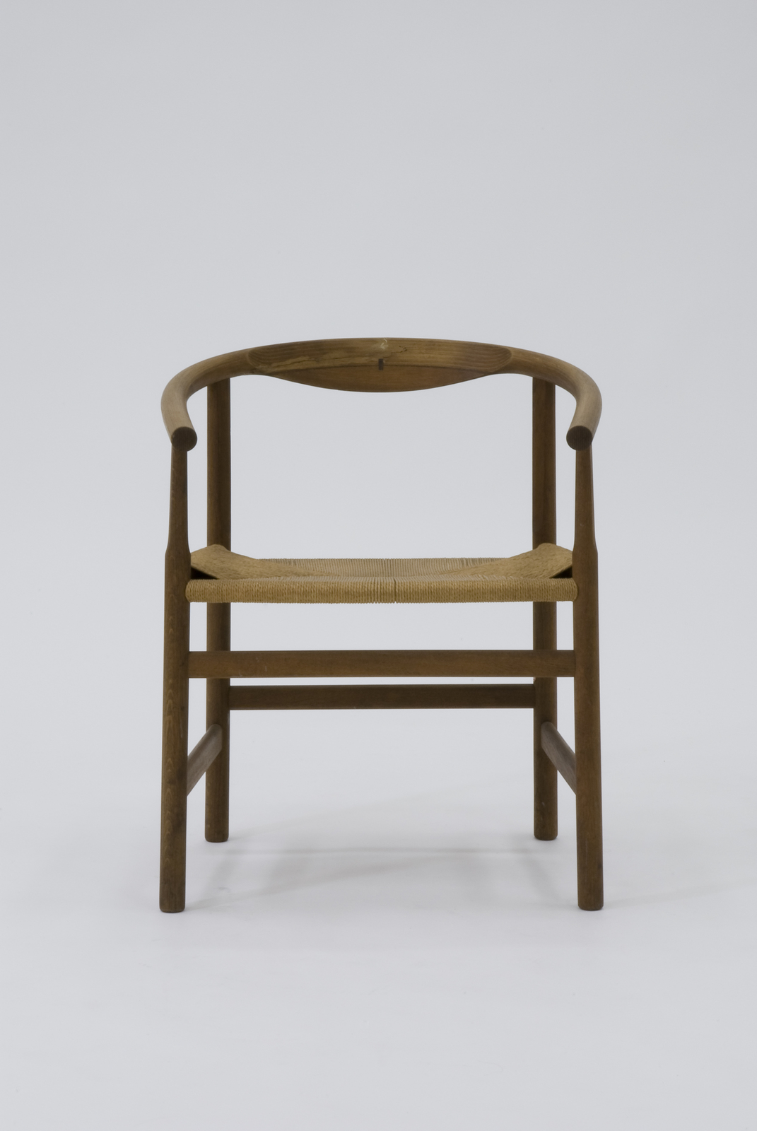 ハンス・ウェグナーの一連のデザインの中でもP.P.モブラー社でつくられているきわめて軽快な雰囲気を持つ椅子。脚は床から座までは太く、そのうえアームまでは両端を削り取り変化を付けて軽快さを出している。座の下の前後左右の貫は各々高さを違えて立体的な構成のおもしろさを出すと同時に強度も出している。背に幅を持たせずに、アームから背に向かってくる接ぎ合わせのところに楢材と違うベンゲを水平方向に挟み込んでいる。装飾のための装飾にするのではなく、構造上に必要な処理をし、結果的に装飾になるのはデザインする上で大切で必要なことだとウェグナーはいう。 |