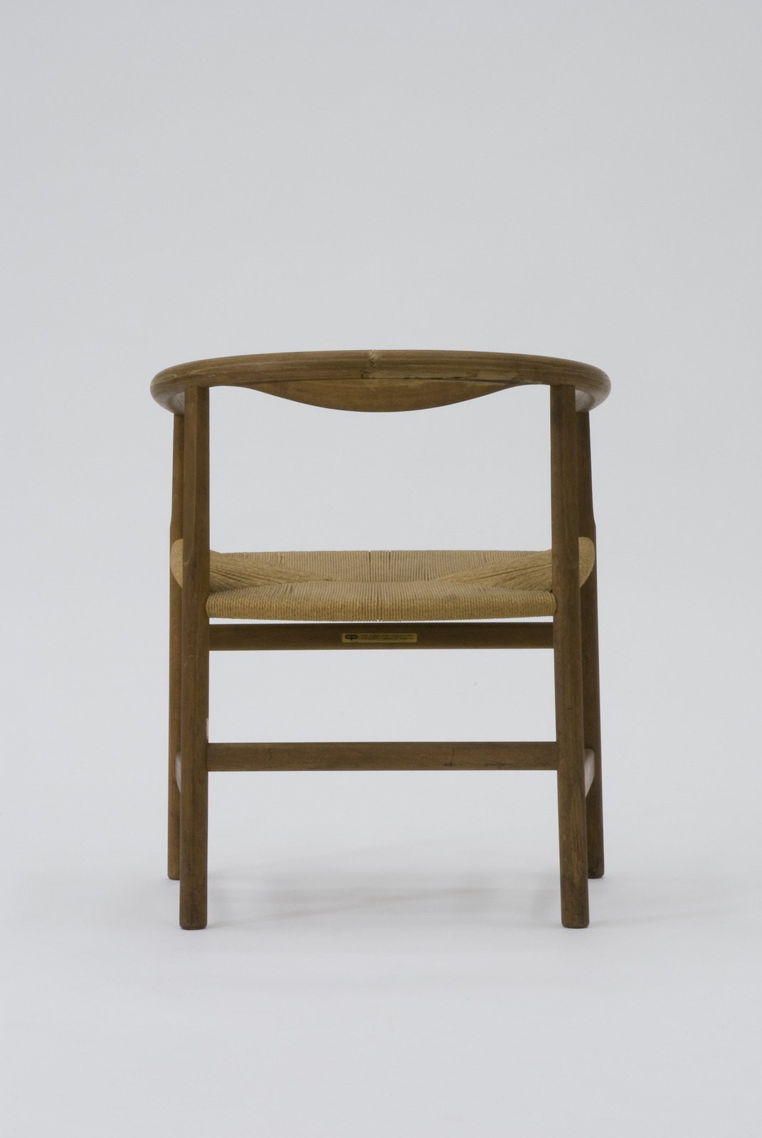 ハンス・ウェグナーの一連のデザインの中でもP.P.モブラー社でつくられているきわめて軽快な雰囲気を持つ椅子。脚は床から座までは太く、そのうえアームまでは両端を削り取り変化を付けて軽快さを出している。座の下の前後左右の貫は各々高さを違えて立体的な構成のおもしろさを出すと同時に強度も出している。背に幅を持たせずに、アームから背に向かってくる接ぎ合わせのところに楢材と違うベンゲを水平方向に挟み込んでいる。装飾のための装飾にするのではなく、構造上に必要な処理をし、結果的に装飾になるのはデザインする上で大切で必要なことだとウェグナーはいう。 |