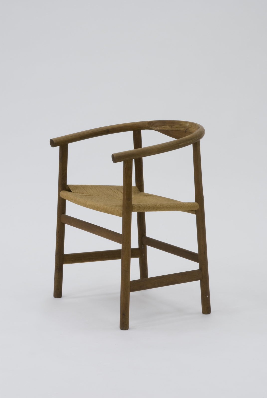 ハンス・ウェグナーの一連のデザインの中でもP.P.モブラー社でつくられているきわめて軽快な雰囲気を持つ椅子。脚は床から座までは太く、そのうえアームまでは両端を削り取り変化を付けて軽快さを出している。座の下の前後左右の貫は各々高さを違えて立体的な構成のおもしろさを出すと同時に強度も出している。背に幅を持たせずに、アームから背に向かってくる接ぎ合わせのところに楢材と違うベンゲを水平方向に挟み込んでいる。装飾のための装飾にするのではなく、構造上に必要な処理をし、結果的に装飾になるのはデザインする上で大切で必要なことだとウェグナーはいう。