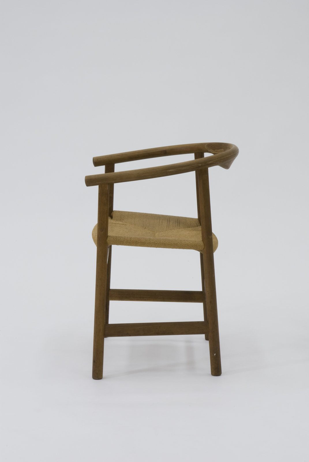 ハンス・ウェグナーの一連のデザインの中でもP.P.モブラー社でつくられているきわめて軽快な雰囲気を持つ椅子。脚は床から座までは太く、そのうえアームまでは両端を削り取り変化を付けて軽快さを出している。座の下の前後左右の貫は各々高さを違えて立体的な構成のおもしろさを出すと同時に強度も出している。背に幅を持たせずに、アームから背に向かってくる接ぎ合わせのところに楢材と違うベンゲを水平方向に挟み込んでいる。装飾のための装飾にするのではなく、構造上に必要な処理をし、結果的に装飾になるのはデザインする上で大切で必要なことだとウェグナーはいう。 |