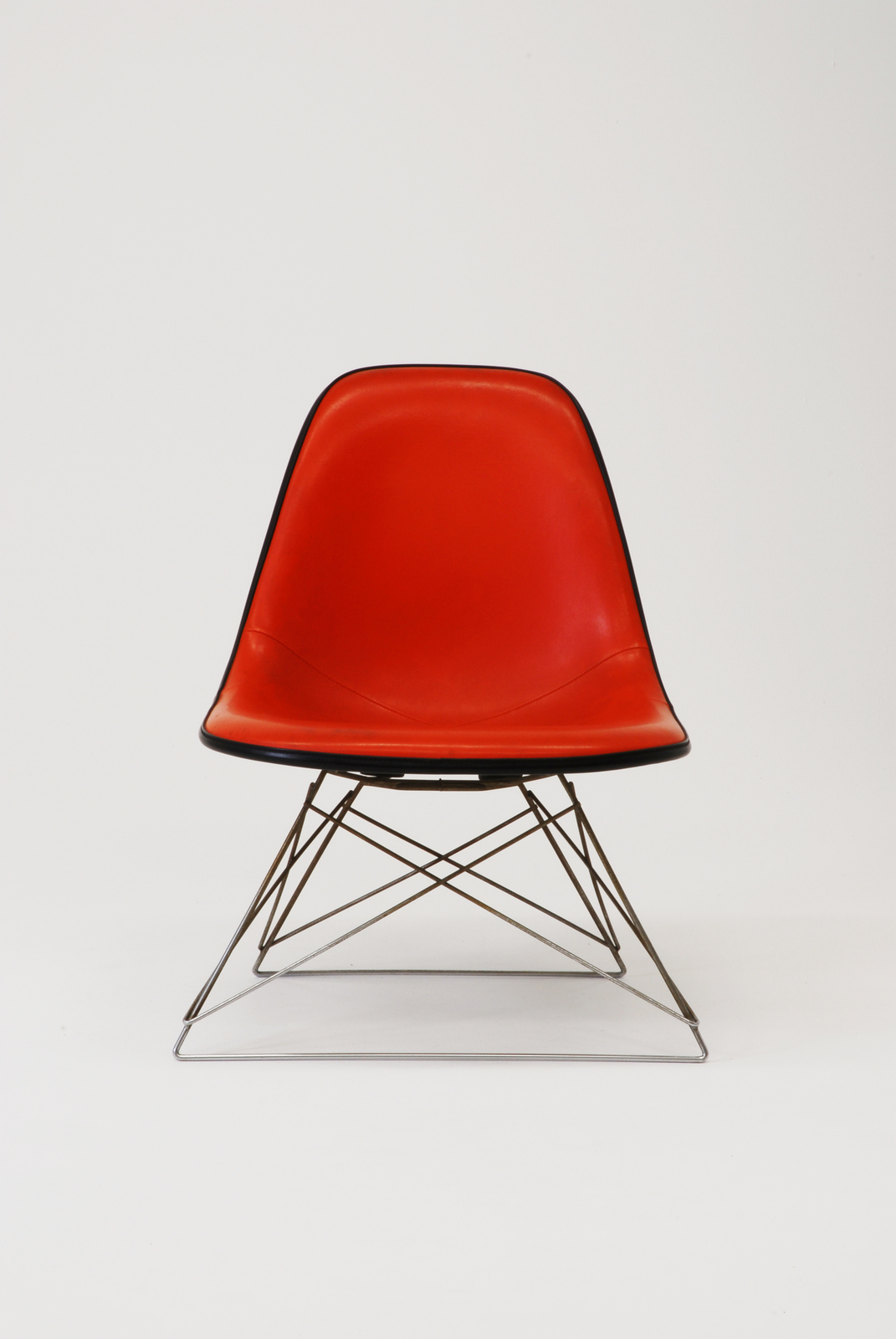 イームズのFRPシリーズのひとつである。サイドチェア用のシェルとスチールロッドで構成された脚の組み合わせで成り立っている。シェルには内部ウレタンに合成皮革または布が張られていて、その縁周りはビニールエッジが取り付けられ、その部分をシェルにはめ込むことで取り付けられている。シェルと脚の取り付け方はシェルの裏側にゴム状の受け座が四箇所付いており、そこに下方よりビスで取り付けている。細いワイヤーロッドの、入り組んだ構造が強度を保証している。それが造形的にも美しい。また他のシェルや他の脚に取り替えられる互換性があり、合理的で生産性がよい。 |