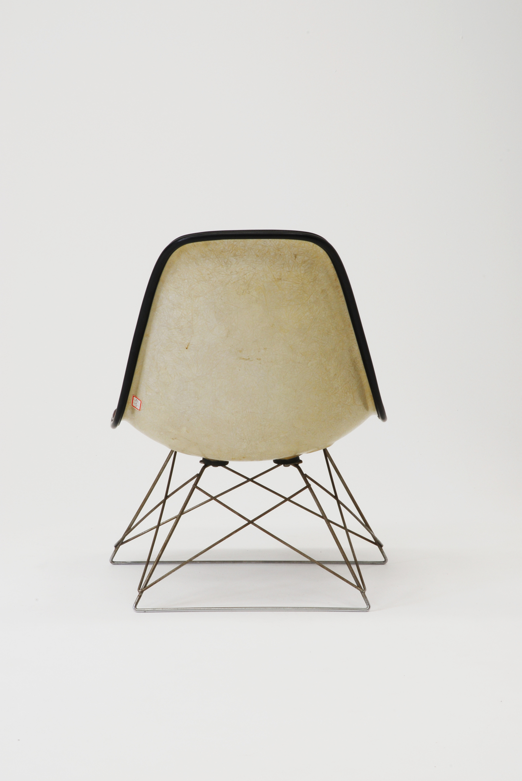 イームズのFRPシリーズのひとつである。サイドチェア用のシェルとスチールロッドで構成された脚の組み合わせで成り立っている。シェルには内部ウレタンに合成皮革または布が張られていて、その縁周りはビニールエッジが取り付けられ、その部分をシェルにはめ込むことで取り付けられている。シェルと脚の取り付け方はシェルの裏側にゴム状の受け座が四箇所付いており、そこに下方よりビスで取り付けている。細いワイヤーロッドの、入り組んだ構造が強度を保証している。それが造形的にも美しい。また他のシェルや他の脚に取り替えられる互換性があり、合理的で生産性がよい。 |