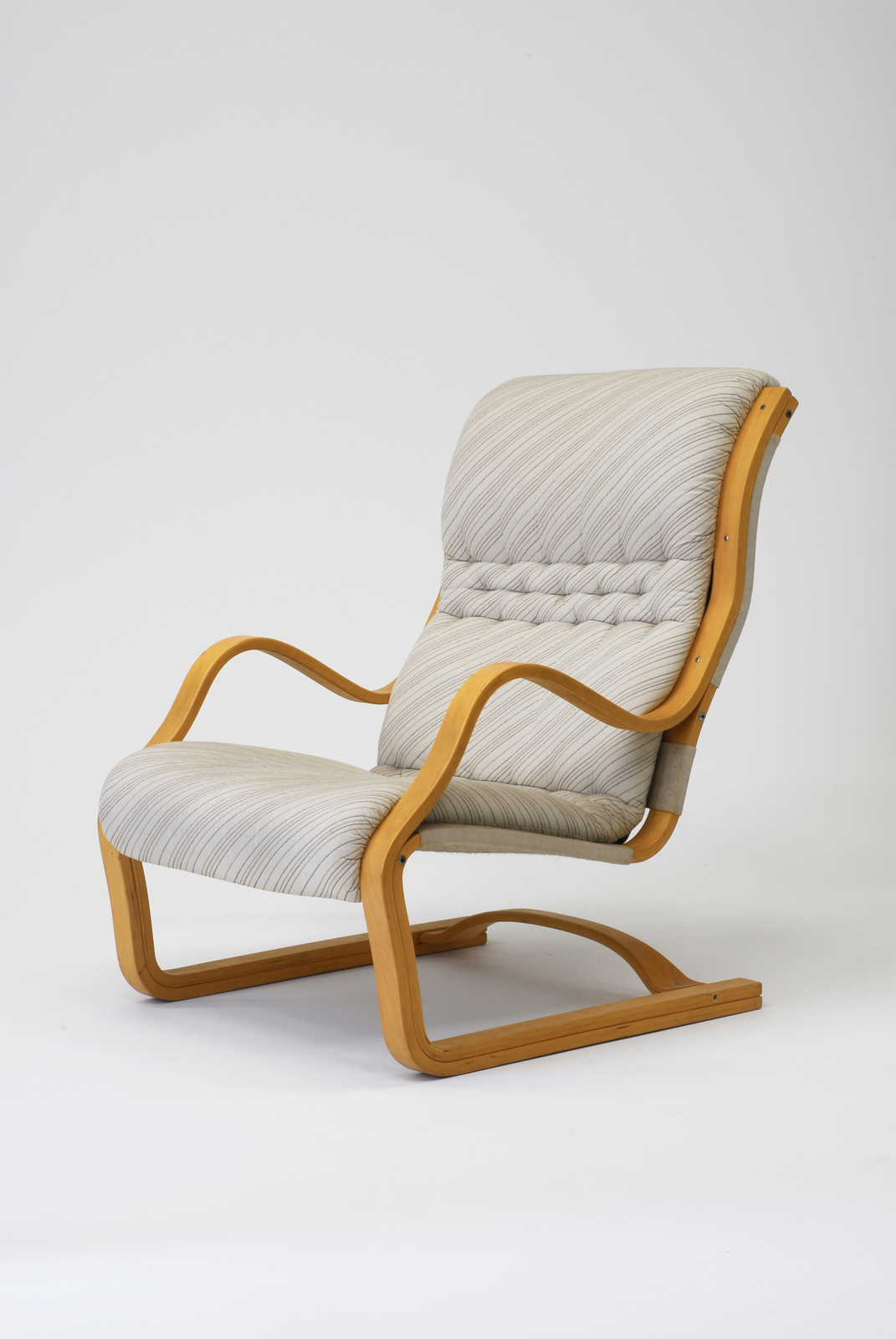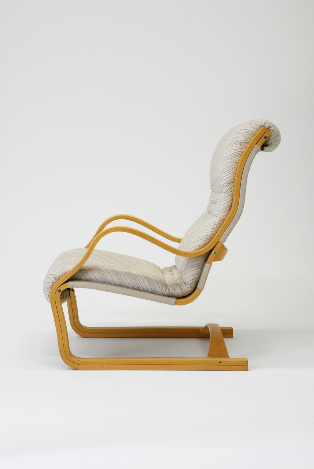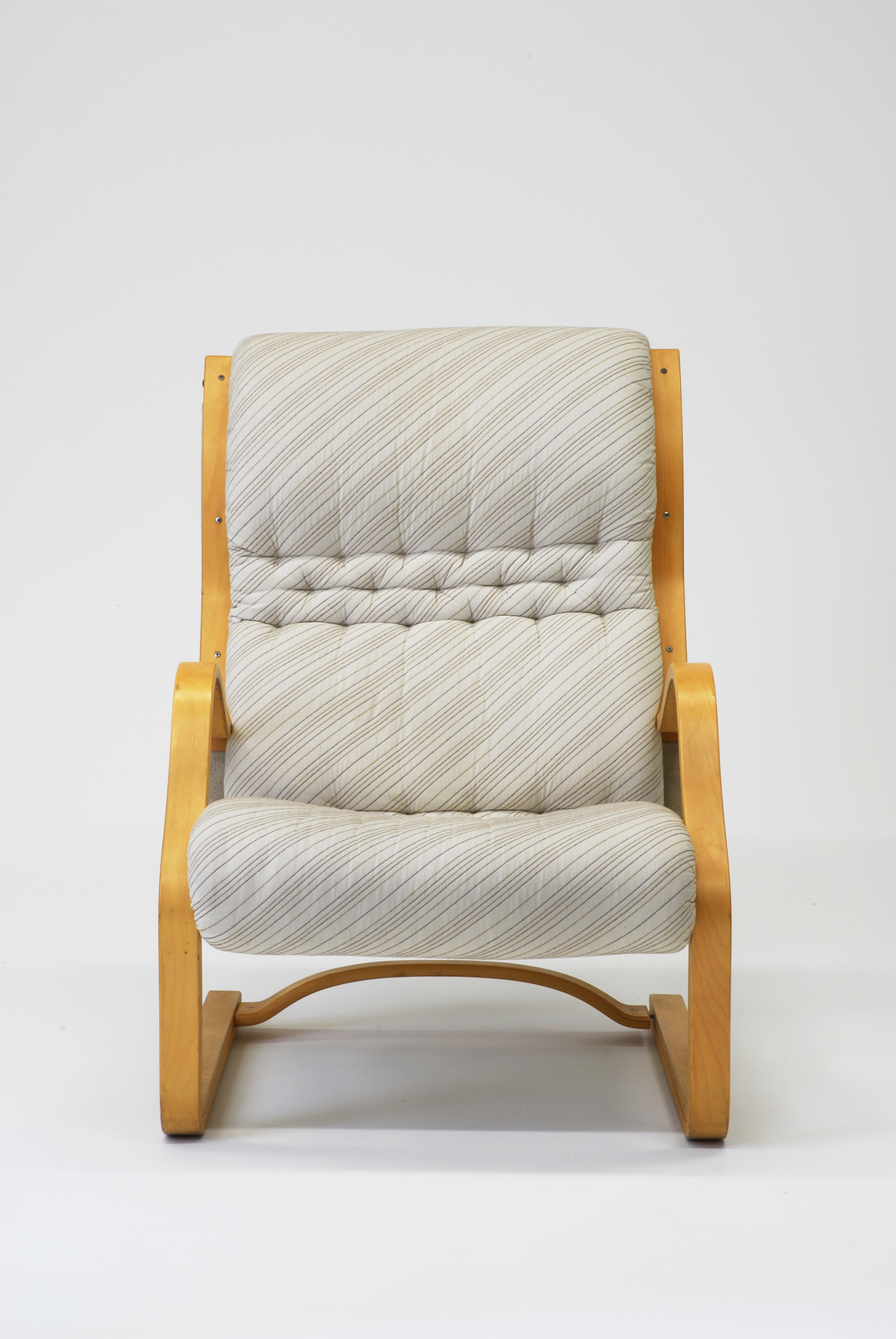 フィンランドはアルバァ・アアルトをはじめ成形合板の椅子に優れた技術を持っている。このカンティレバーの椅子は、大変大振りで、しかもハイバックのため、いかにも休息用といえる。力がかかる前脚と畳ずりの部分には、背から下ってくる部分とアームから降りてくる部分の成型合板が重なる二重構造で強くできている。1978年頃はフィンランド家具の転換期で、ヨーロッパでも有数の優れた会社であったアスコ社も新しい方向への家具を模索し生産していた。この椅子は、成形合板を用いた片持ち構造で、クッションは厚く柔らかくボタンどめにしている。柔らかさとクッション性を追求した椅子といえるだろう。 |
