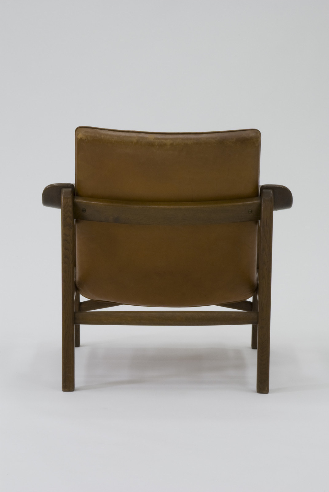 1930年代の終わりにデザインされ、1940年のコペンハーゲン家具職人組合の展覧会のブースでグスタフ・ペデルセンの工房に展示されたアームチェアである。展覧会のディスプレイでは暖炉の前に毛皮が敷かれ、その上にこの椅子は置かれていたために、ファイヤープレースチェアとも呼ばれている。前脚の貫がX型につくられていて、前脚からアーム、背へとつながる木部のアームの上にまた小さな平板状のアームをつけているのが特徴的である。一体の背と座は革張りで、革のベルトの上にのせるという非常に珍しい構造である。全体的に骨太な構造の中に近代デザインへの方向が感じられる椅子である。