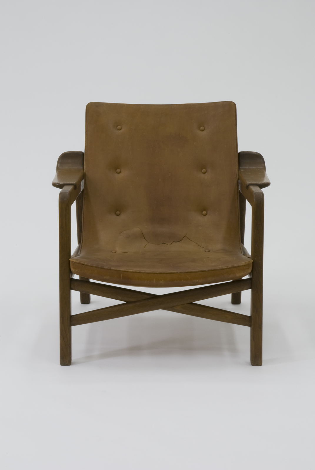 1930年代の終わりにデザインされ、1940年のコペンハーゲン家具職人組合の展覧会のブースでグスタフ・ペデルセンの工房に展示されたアームチェアである。展覧会のディスプレイでは暖炉の前に毛皮が敷かれ、その上にこの椅子は置かれていたために、ファイヤープレースチェアとも呼ばれている。前脚の貫がX型につくられていて、前脚からアーム、背へとつながる木部のアームの上にまた小さな平板状のアームをつけているのが特徴的である。一体の背と座は革張りで、革のベルトの上にのせるという非常に珍しい構造である。全体的に骨太な構造の中に近代デザインへの方向が感じられる椅子である。