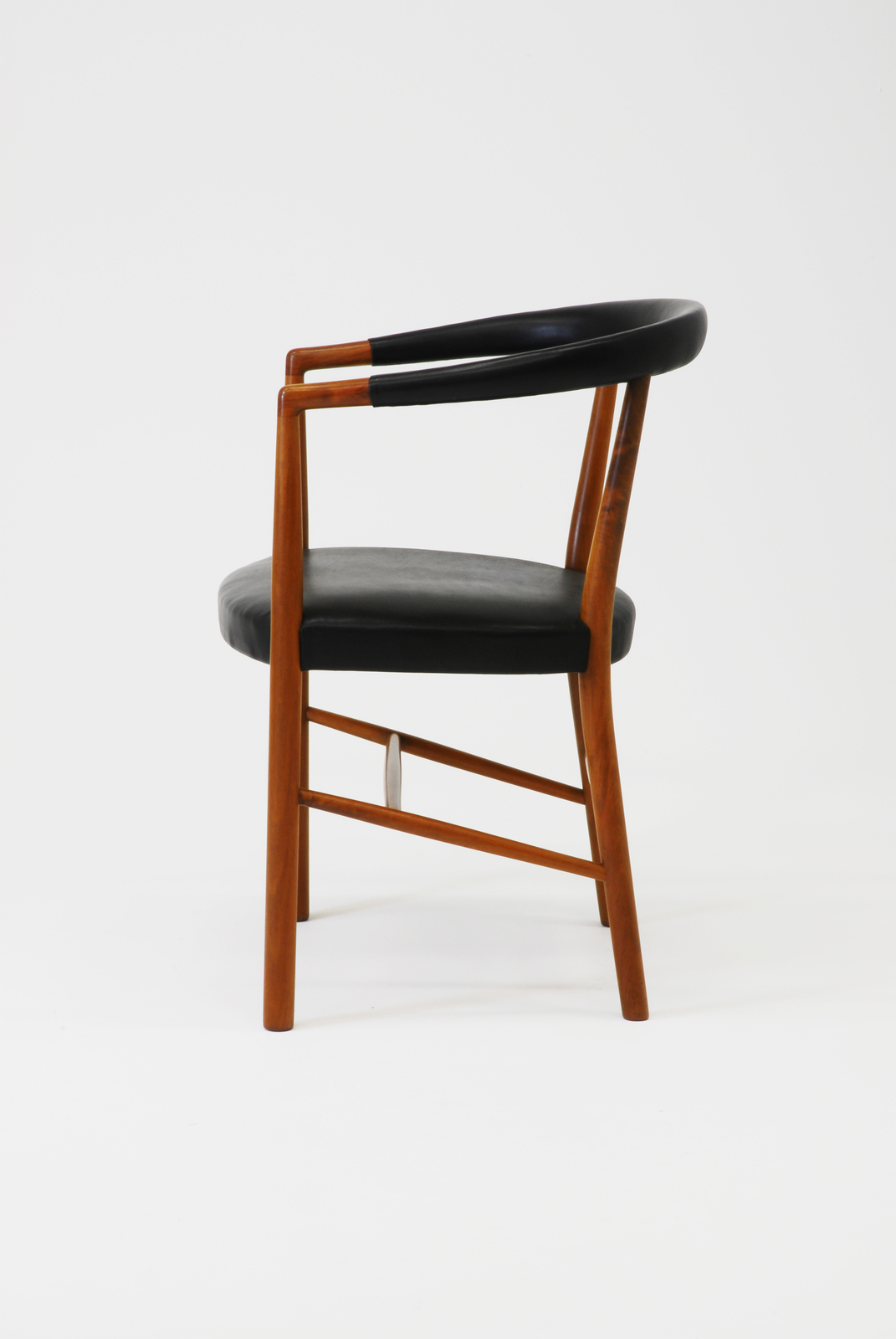 ヤコブ・ケアは、デザイナーというより家具つくりのマイスターである。この椅子は木を知り尽くした職人であるヤコブ・ケアが、細かいところまで気を使いデザインしたものである。座は木枠に革張りのクッションが張りくるんである。また左右のアームから背にかけては徐々に太さを変えながら革を巻いている。そのアームの先端の部分は革を薄くして折り返し、きれいな処理がされている。一見地味だが、細部にわたってみると、この椅子はすばらしいディティールの集積でつくられている。 |