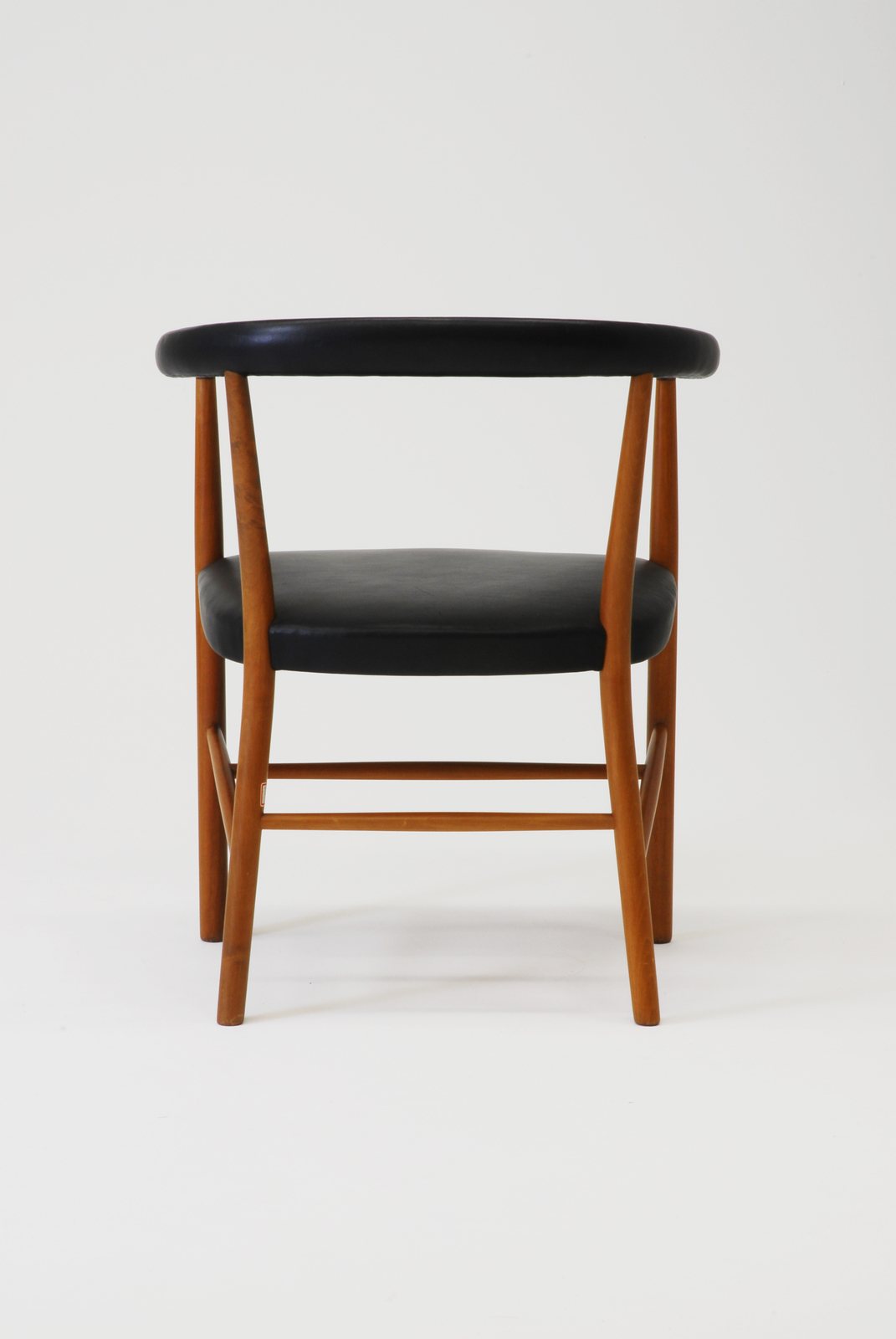 ヤコブ・ケアは、デザイナーというより家具つくりのマイスターである。この椅子は木を知り尽くした職人であるヤコブ・ケアが、細かいところまで気を使いデザインしたものである。座は木枠に革張りのクッションが張りくるんである。また左右のアームから背にかけては徐々に太さを変えながら革を巻いている。そのアームの先端の部分は革を薄くして折り返し、きれいな処理がされている。一見地味だが、細部にわたってみると、この椅子はすばらしいディティールの集積でつくられている。 |