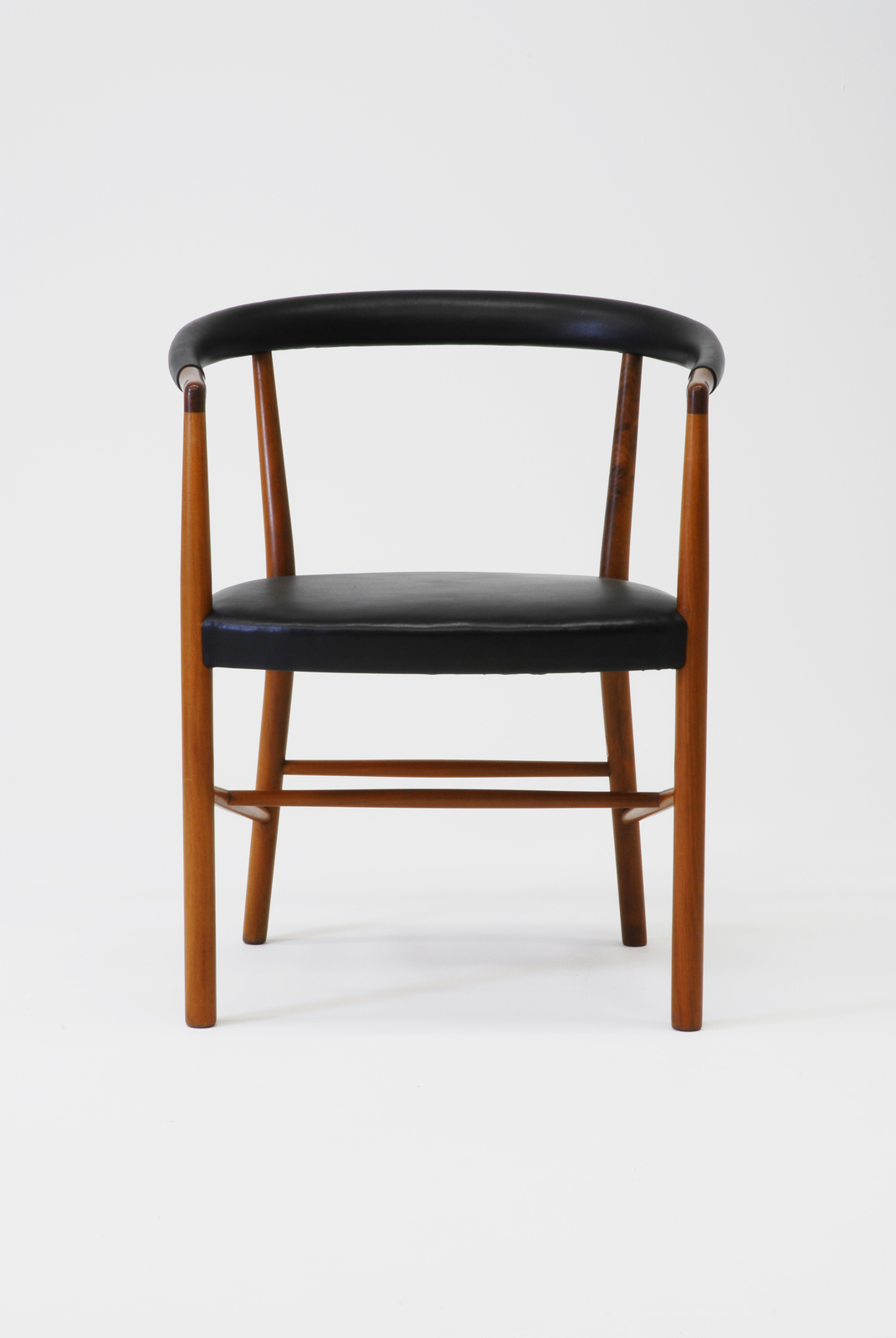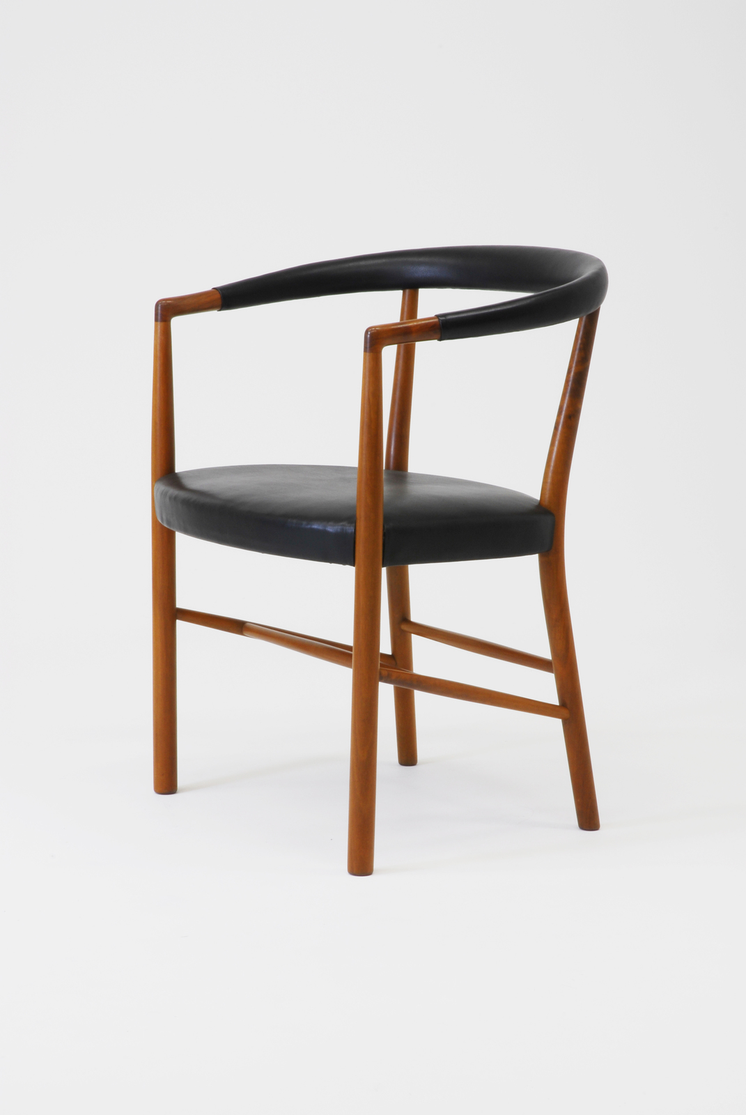 ヤコブ・ケアは、デザイナーというより家具つくりのマイスターである。この椅子は木を知り尽くした職人であるヤコブ・ケアが、細かいところまで気を使いデザインしたものである。座は木枠に革張りのクッションが張りくるんである。また左右のアームから背にかけては徐々に太さを変えながら革を巻いている。そのアームの先端の部分は革を薄くして折り返し、きれいな処理がされている。一見地味だが、細部にわたってみると、この椅子はすばらしいディティールの集積でつくられている。 |