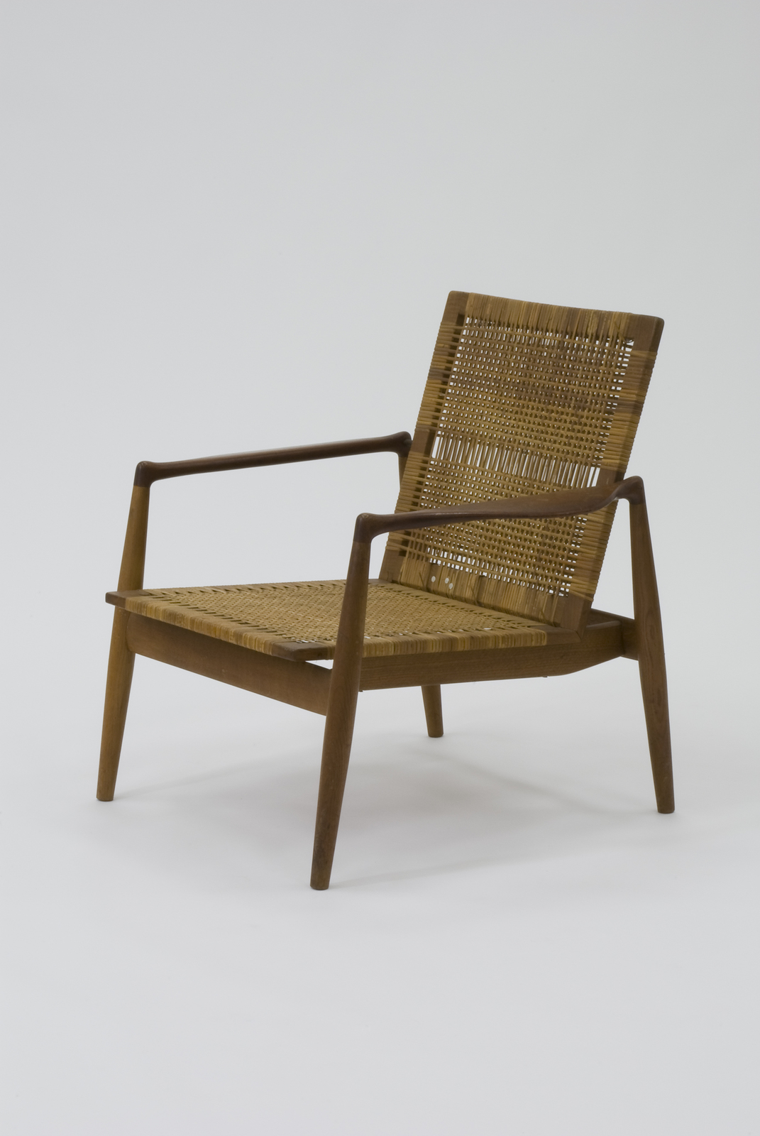 彫刻的なフォルムと家具職人の優れた力を背景にデザインしてきたフィン・ユールが、より大きなマーケットを意識して、部分的に機械生産することを考えてつくられた椅子。座と背を籐で張り、座り心地と軽快さを出し、背を後ろ脚と金属でつないでいるところに新しい姿勢を見せようとしていた。量産性の効く丸脚に対し水平方向のアームには彼らしい美しい造形をつくり出し、手作りの良さも出している。 |
