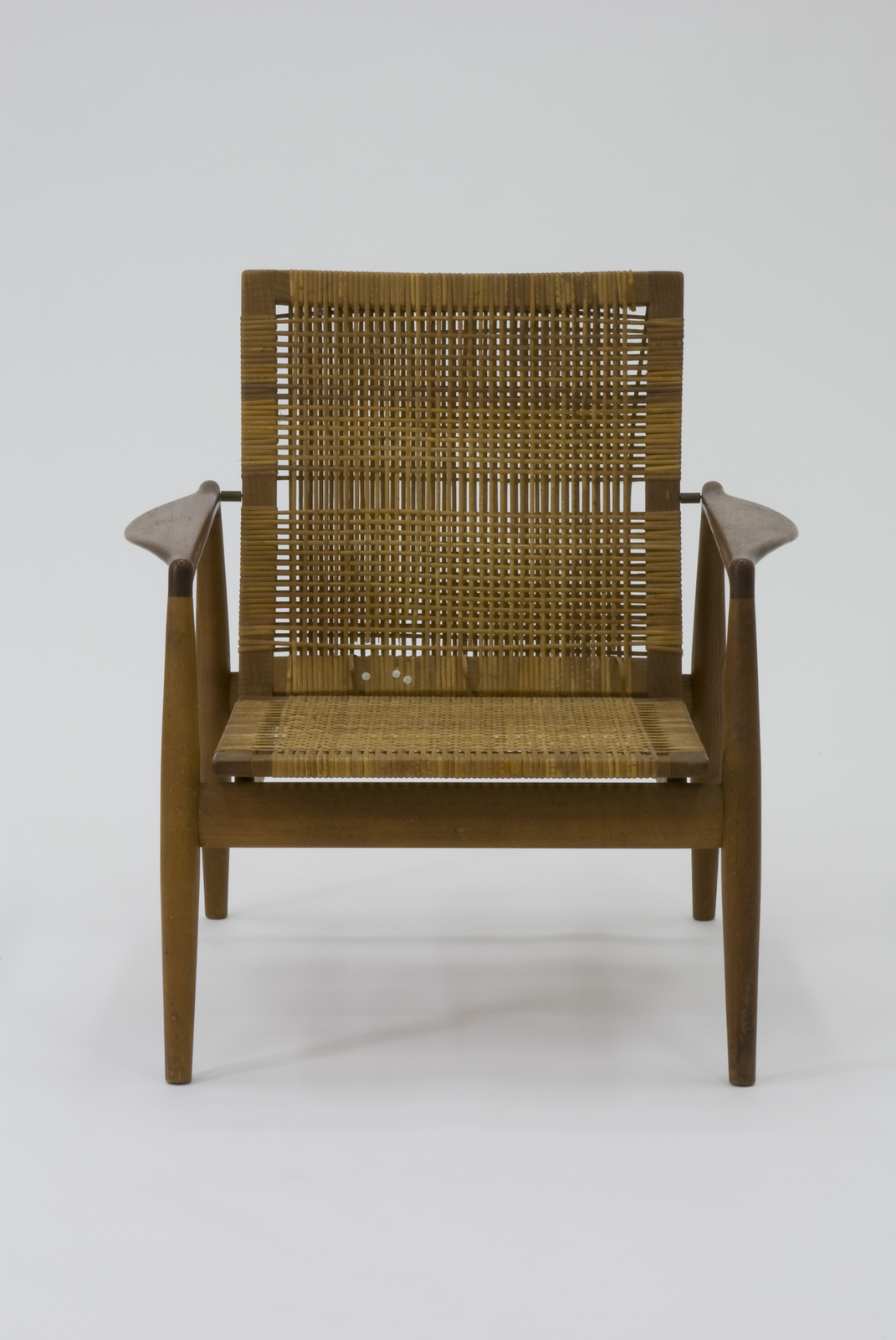彫刻的なフォルムと家具職人の優れた力を背景にデザインしてきたフィン・ユールが、より大きなマーケットを意識して、部分的に機械生産することを考えてつくられた椅子。座と背を籐で張り、座り心地と軽快さを出し、背を後ろ脚と金属でつないでいるところに新しい姿勢を見せようとしていた。量産性の効く丸脚に対し水平方向のアームには彼らしい美しい造形をつくり出し、手作りの良さも出している。 |