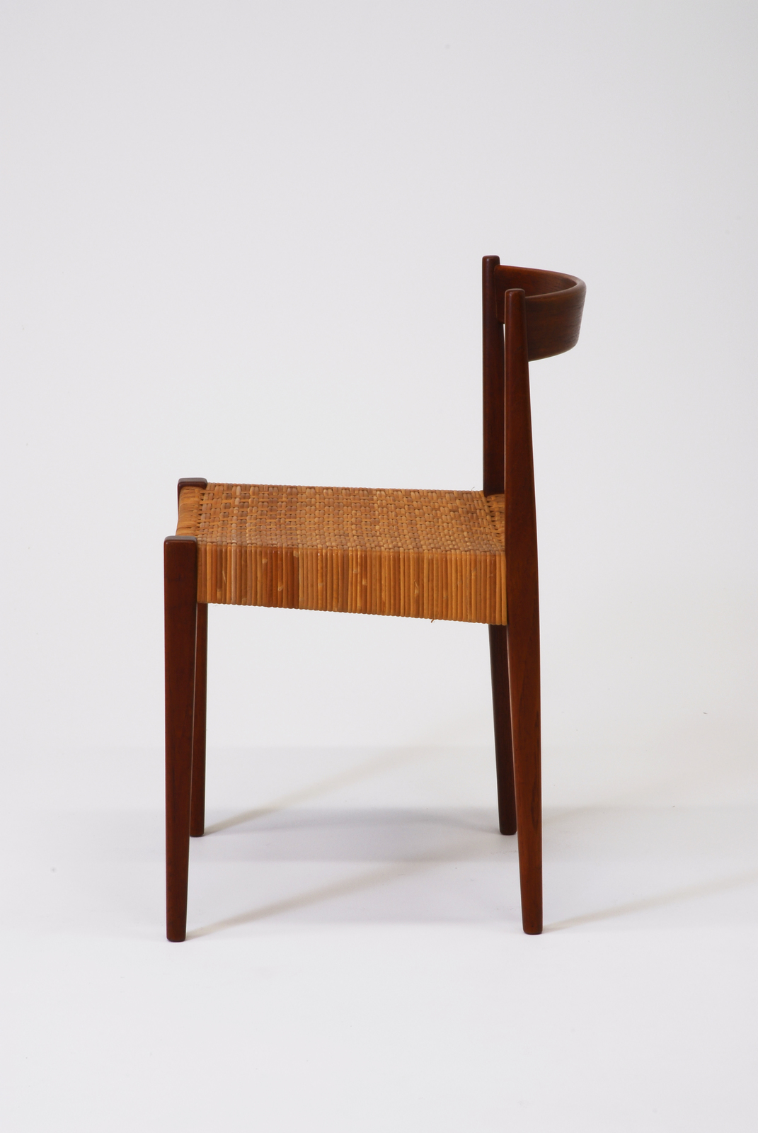 ナンナ・ディッツェルは夫のヨルゲン・ディッツェルと共に1950年代にデンマークの家具業界で活躍をしていたが、夫の死後一時活動をやめていた。1980年代から、不死鳥のごとく、優れたデザインを生みだし、今日デンマークでは長老ながら最も若々しいデザイナーとして、家具だけではなく、ジョージ・ハンセンのアクセサリー、時計のデザインなど幅広い分野を手掛けている。この椅子はチーク材と当時流行していた籐で座を張った椅子で、チーク材の脚はシャープな角を立て、床面に近づくにつれて細く軽やかなフォルムを見せている。この時代のデンマークの椅子の1つの典型ともいうデザインである。