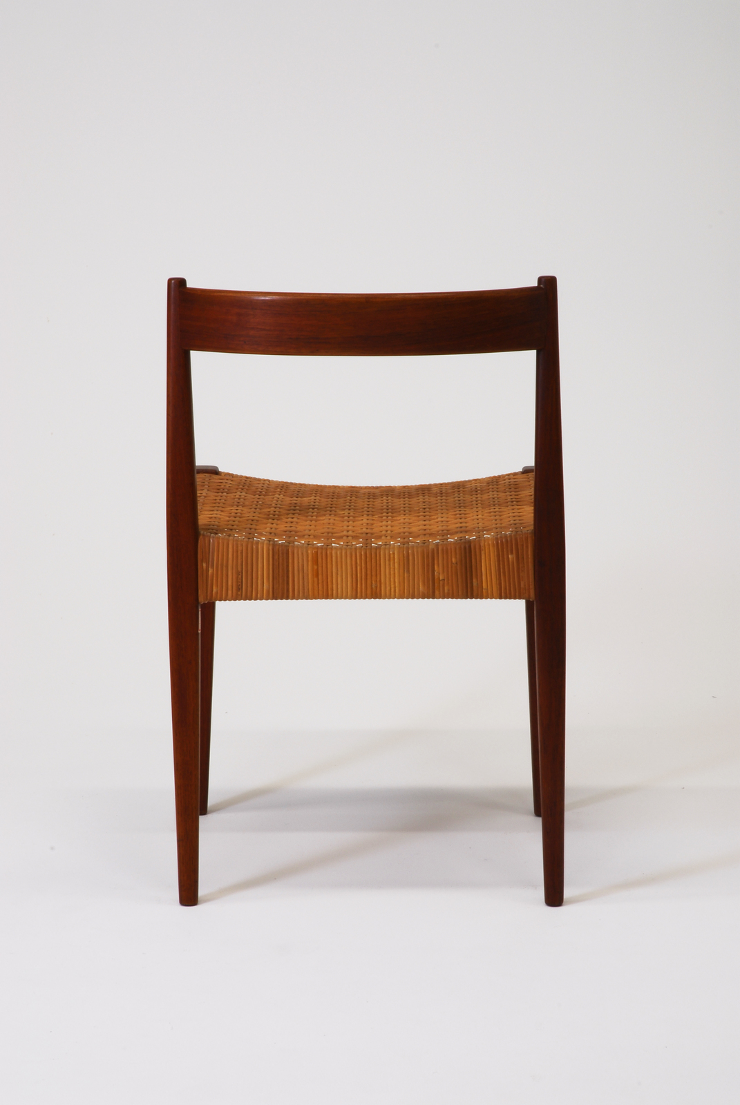ナンナ・ディッツェルは夫のヨルゲン・ディッツェルと共に1950年代にデンマークの家具業界で活躍をしていたが、夫の死後一時活動をやめていた。1980年代から、不死鳥のごとく、優れたデザインを生みだし、今日デンマークでは長老ながら最も若々しいデザイナーとして、家具だけではなく、ジョージ・ハンセンのアクセサリー、時計のデザインなど幅広い分野を手掛けている。この椅子はチーク材と当時流行していた籐で座を張った椅子で、チーク材の脚はシャープな角を立て、床面に近づくにつれて細く軽やかなフォルムを見せている。この時代のデンマークの椅子の1つの典型ともいうデザインである。