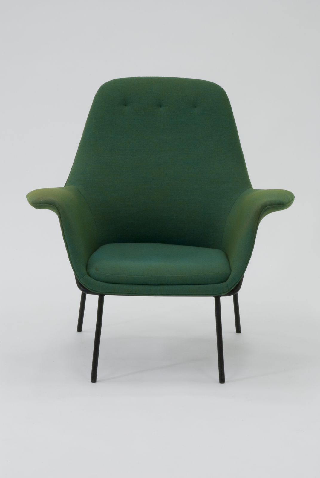 基本フレームはスチールパイプを用い、背と座の芯を構成している。背は布張り仕上げで、座とアームに関しては成形合板がフレームの上に施されている。さらにその上にウレタンを施し布張りで仕上げにしている。また座には大きめのクッションがのせられている。脚部の上に座部分を載せ、それを外側から止めている仕組みと思われる。ジャンカルロ・デ・カルロは1940年代後半から機能的なフォルムのデザインを多く発表している。 |