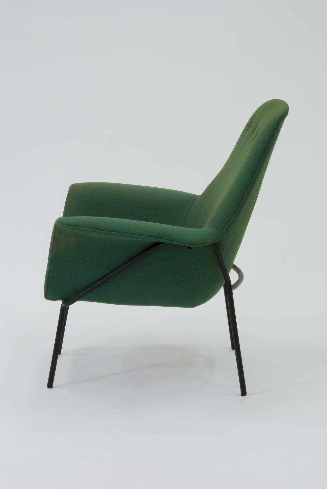 基本フレームはスチールパイプを用い、背と座の芯を構成している。背は布張り仕上げで、座とアームに関しては成形合板がフレームの上に施されている。さらにその上にウレタンを施し布張りで仕上げにしている。また座には大きめのクッションがのせられている。脚部の上に座部分を載せ、それを外側から止めている仕組みと思われる。ジャンカルロ・デ・カルロは1940年代後半から機能的なフォルムのデザインを多く発表している。 |