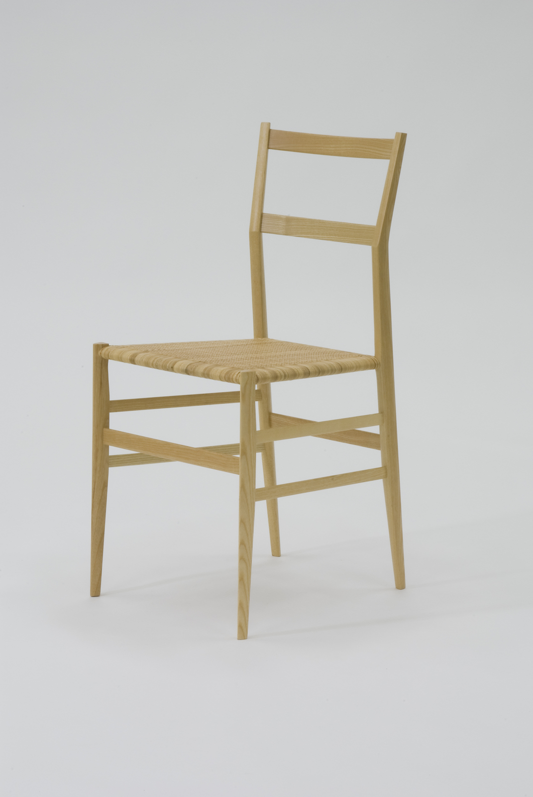 世界で最も軽く、子供でも持てる椅子である。この椅子を発表する以前にジオ・ポンティは、丸い棒材を先に行くほど細くして床に接地する手前で急に太くするというような椅子をデザインしていた。これらの原形となるのは、地中海沿岸の農民たちがつくっていた椅子などもその1つに含まれる。それを受け継ぎながら特徴を持たせるため、この椅子の脚の断面を縦方向の三角形にしており、弾力性に富むヒッコリー(トネリコ)を用いてつくられている。座は発表当時は、わらで編んでいたが、のちに籐で編むようになった。現在では布張りのバリエーションもある。余りにも軽く、細いために座る人が注意して座るところが、長持ちする理由のひとつかもしれない。 |