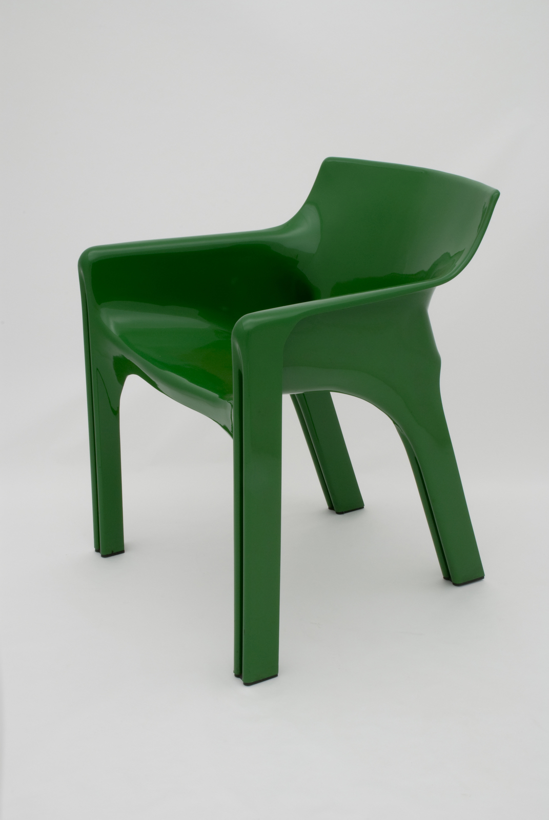 背から座そして脚部までもを一体化するためにプレス成形によるFRPでつくられた椅子である。脚部の断面形状はM字になっており、これがリブの役目も果たし安定度も増している。ヴィコ・マジストレッティは1960年代から常にイタリアデザインのトップランナーとしていくつもの優れた椅子や照明器具を発表している。フォルムの美しさだけではなく、機構の面白さ、新鮮さで高い評価を得ている。最近ではデンマークのメーカーから新しい椅子を発表している。 |