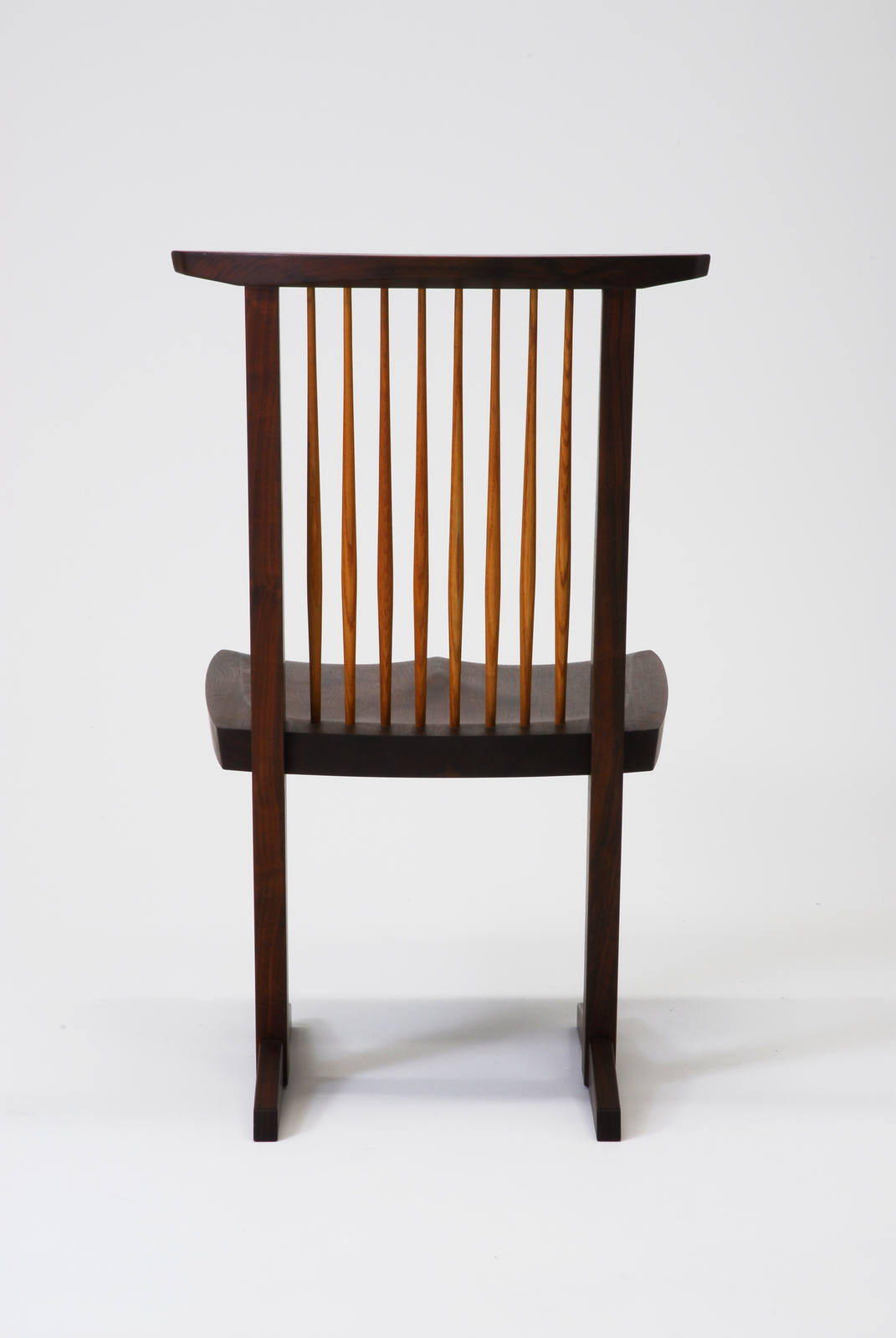 この椅子は木製のカンティレバー構造で脚が2本しかなく、脚と座の接合部には強度を持たせ、変形しないように丈夫に出来ている。座が2本の脚に近づくにつれて少しずつ厚みを増していくことで、座自身が横方向の貫の役目を兼ねている。通常なら、脚にも貫を入れるが、座と背だけで全体の強度をもたせており、これ以上シンプルなものはない。この椅子の一番美しいところは真横から見たところである。スポーク状の背もたれはヒッコリーを使い、旋盤を使わず小鉋で削り、面を取り、1本1本違った表情を持ったものにしている。なお、コノイドという名前は彼のアトリエの屋根の形からとったものである。 |