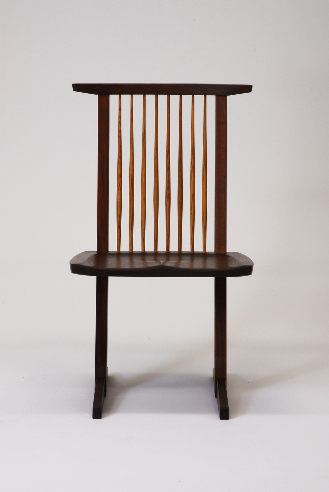 この椅子は木製のカンティレバー構造で脚が2本しかなく、脚と座の接合部には強度を持たせ、変形しないように丈夫に出来ている。座が2本の脚に近づくにつれて少しずつ厚みを増していくことで、座自身が横方向の貫の役目を兼ねている。通常なら、脚にも貫を入れるが、座と背だけで全体の強度をもたせており、これ以上シンプルなものはない。この椅子の一番美しいところは真横から見たところである。スポーク状の背もたれはヒッコリーを使い、旋盤を使わず小鉋で削り、面を取り、1本1本違った表情を持ったものにしている。なお、コノイドという名前は彼のアトリエの屋根の形からとったものである。 |