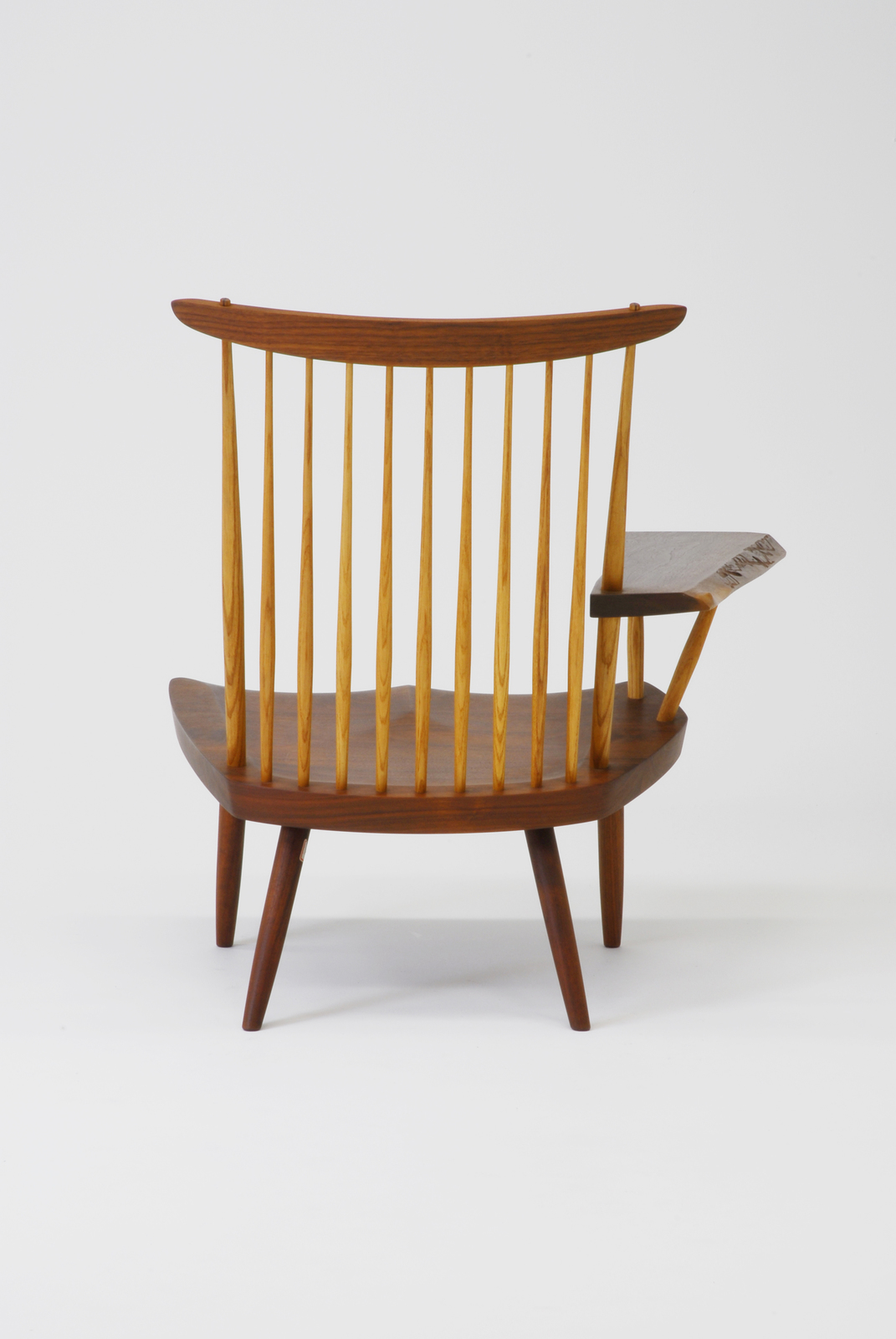 素材はウォールナット材の無垢材で、背のスポーク状の部分だけはアッシュ材が用いられている。座面が無垢材であり、クッション付きの椅子に比べたら硬く感じられるはずだが、この椅子は座が臀部の形状にあわせてつくられていて、硬さをあまり感じさせない曲面になっている。そしてそのデザインが美しいフォルムとなって表現されている。無垢材の良さを十分に表現している椅子である。右肘を兼ねたサイドテーブルは、見る人にもグラスを置いてくつろぎの時を連想させる椅子である。 |