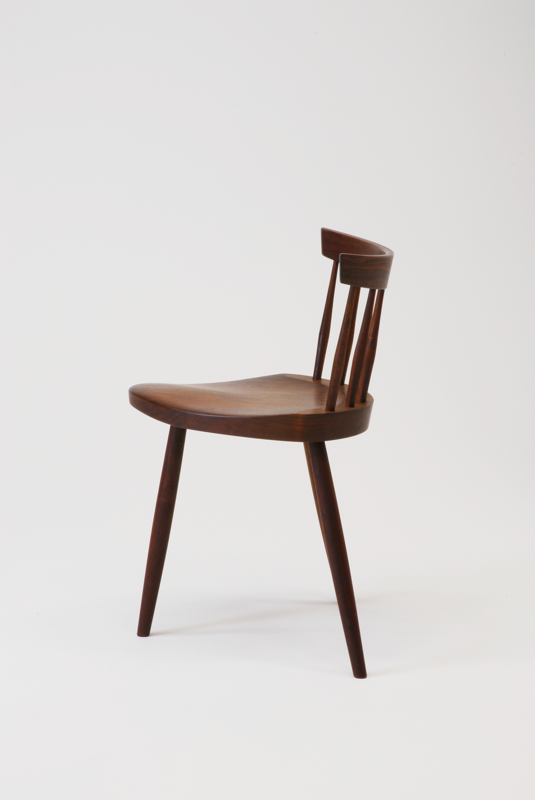 ミラーチェアという名は彼の娘からつけられた。ジョージ・ナカシマの一連の作品同様に、ウォールナット材でできており、背のスポークの部分だけがアッシュ材である。スポークは座の後ろの部分から出て、笠木に差し込まれている。3本脚で、座面高が高いが貫は施されていない。これは分厚い座面に脚がしっかり差し込まれている構造だからである。ジョージ・ナカシマは日系アメリカ人で、建築家として世界各地で活躍した。彼の椅子は高松の桜製作所もライセンス生産している。 |