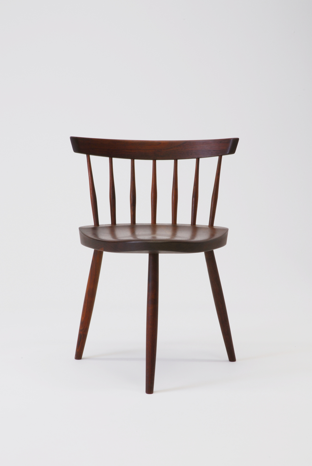 ミラーチェアという名は彼の娘からつけられた。ジョージ・ナカシマの一連の作品同様に、ウォールナット材でできており、背のスポークの部分だけがアッシュ材である。スポークは座の後ろの部分から出て、笠木に差し込まれている。3本脚で、座面高が高いが貫は施されていない。これは分厚い座面に脚がしっかり差し込まれている構造だからである。ジョージ・ナカシマは日系アメリカ人で、建築家として世界各地で活躍した。彼の椅子は高松の桜製作所もライセンス生産している。 |