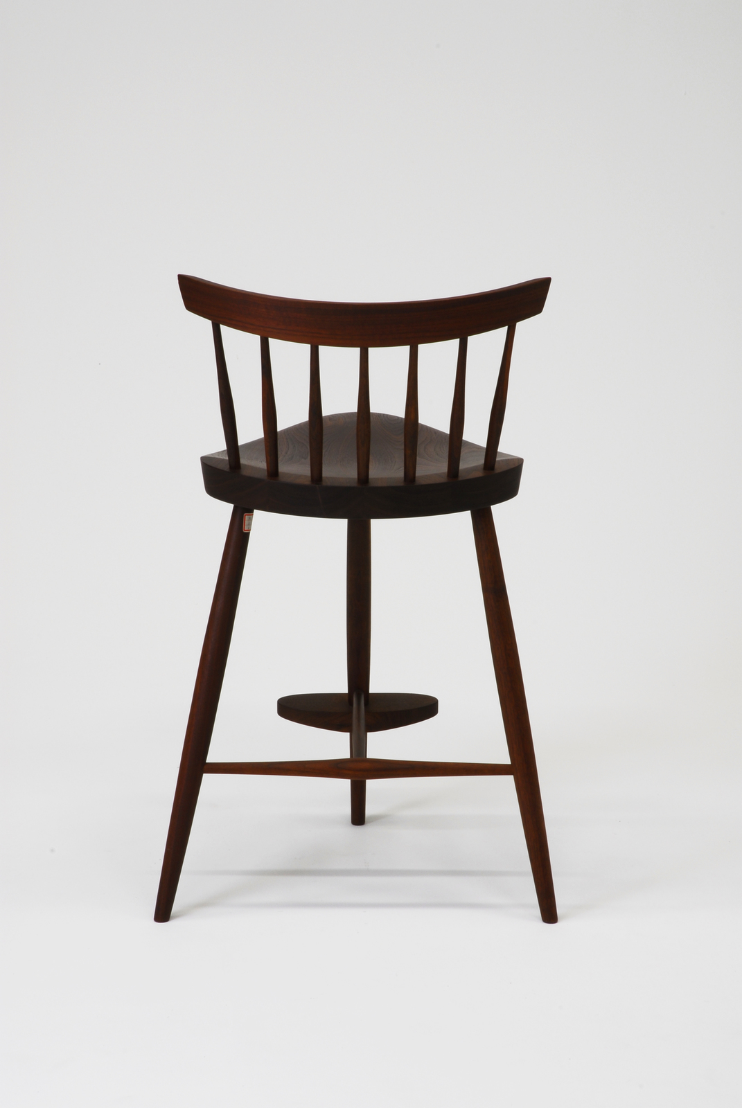 ミラチェア ロー(124)よりも更に座面が高く、さすがに不安定になるので、この椅子の脚にはT字型の貫が施されれている。この貫はそれぞれの脚に直接差し込まれており、中央が少し太く、両端が細くなるテーパー加工がなされている。座面はウォルナットの狭い幅の無垢材をフィンガージョイントで接合して広さをつくっている。前脚に水平に取り付けられた足掛けの形態がこの椅子に特長を与えている。