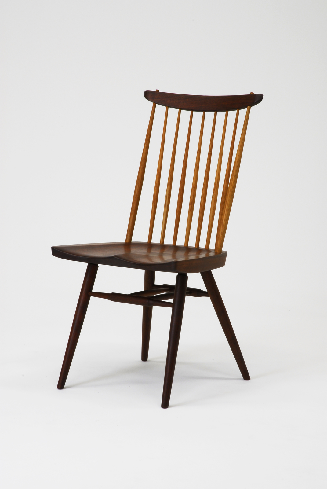 ミラーチェア(124、128)とほぼ同じ材料と構造である。4本脚でも貫が施されているのは、ミラーチェアの安定性に対する反省からであると考えられる。ジョージ・ナカシマの一連の作品と異なる点は、脚の付け根である座面に差し込む部分と貫の先端部分の加工が、2段彫りになっている点である。近代椅子のルーツともいえるイギリスのウインザーチェアからの影響を強く感じられるデザイン。独自の工房でクラフトマンシップを前面に出した、ジョージ・ナカシマらしい椅子。 |