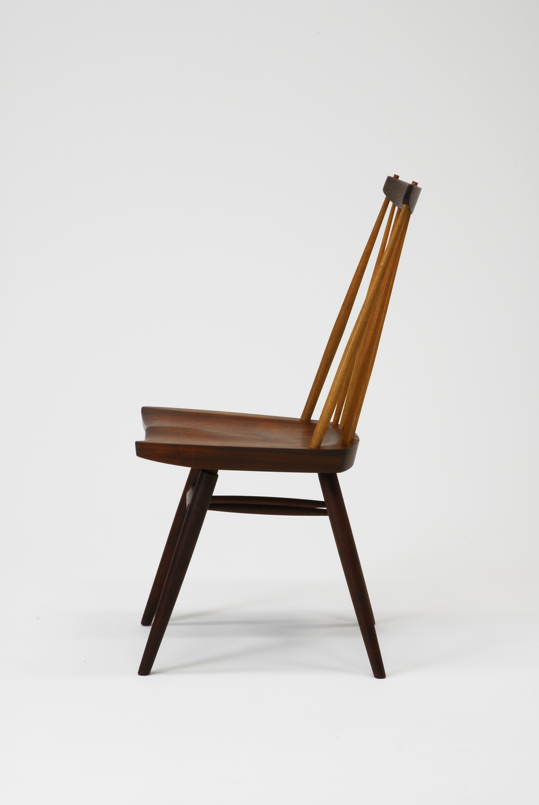 ミラーチェア(124、128)とほぼ同じ材料と構造である。4本脚でも貫が施されているのは、ミラーチェアの安定性に対する反省からであると考えられる。ジョージ・ナカシマの一連の作品と異なる点は、脚の付け根である座面に差し込む部分と貫の先端部分の加工が、2段彫りになっている点である。近代椅子のルーツともいえるイギリスのウインザーチェアからの影響を強く感じられるデザイン。独自の工房でクラフトマンシップを前面に出した、ジョージ・ナカシマらしい椅子。 |