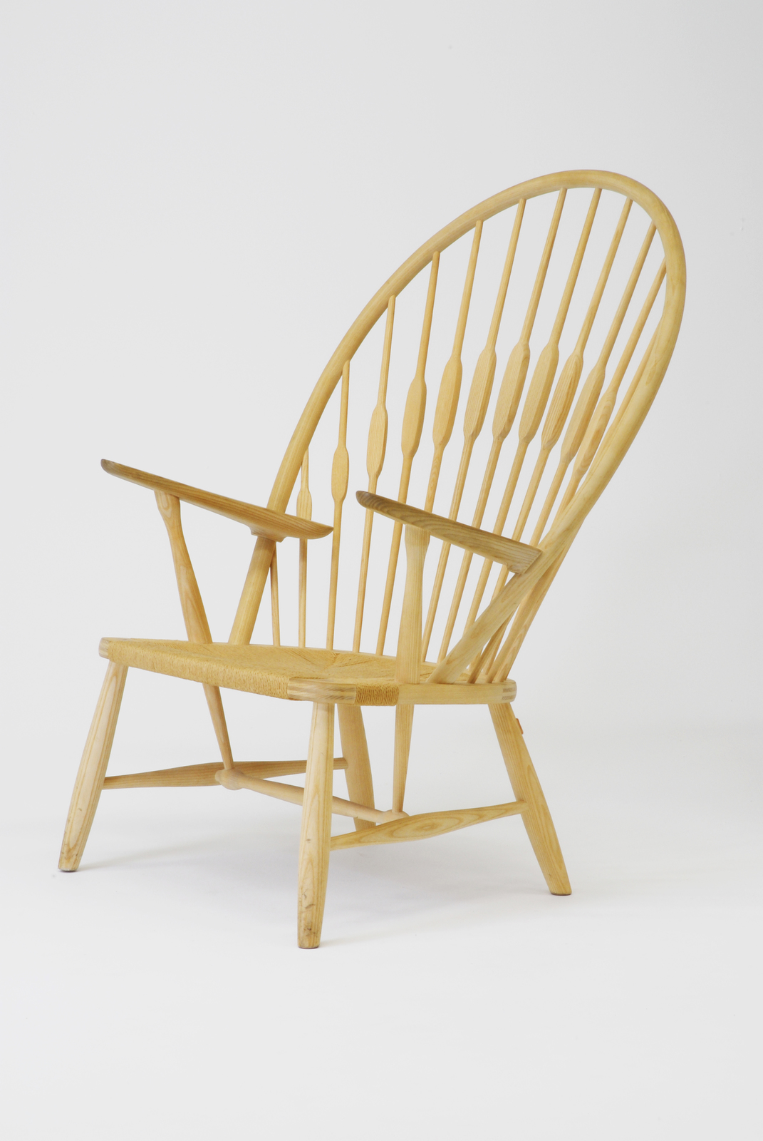 ウインザーチェアをデザインのモチーフとし、背の丸棒の中央に平らな部分をつくり、その名のとおり孔雀の羽根を広げたようなフォルムを持った椅子である。ピーコックという名は、ハンス・ウェグナーの友人であったフィン・ユールがつけた。また背のスポークが弓矢の形に似ていることから「アローチェア」とも呼ばれる。材料にトネリコを使用し、漂白し、無公害のソープフィニッシュ仕上げでよりいっそう軽さを出している。座はペーパーコードで編み、アームに汚れが目立たないようにチーク材を使って木の色のコントラストを出しているタイプもある。背の外周は当初成形合板であったが、現在は曲木でつくられている。 |