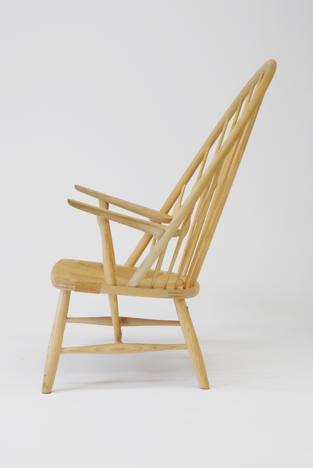 ウインザーチェアをデザインのモチーフとし、背の丸棒の中央に平らな部分をつくり、その名のとおり孔雀の羽根を広げたようなフォルムを持った椅子である。ピーコックという名は、ハンス・ウェグナーの友人であったフィン・ユールがつけた。また背のスポークが弓矢の形に似ていることから「アローチェア」とも呼ばれる。材料にトネリコを使用し、漂白し、無公害のソープフィニッシュ仕上げでよりいっそう軽さを出している。座はペーパーコードで編み、アームに汚れが目立たないようにチーク材を使って木の色のコントラストを出しているタイプもある。背の外周は当初成形合板であったが、現在は曲木でつくられている。 |