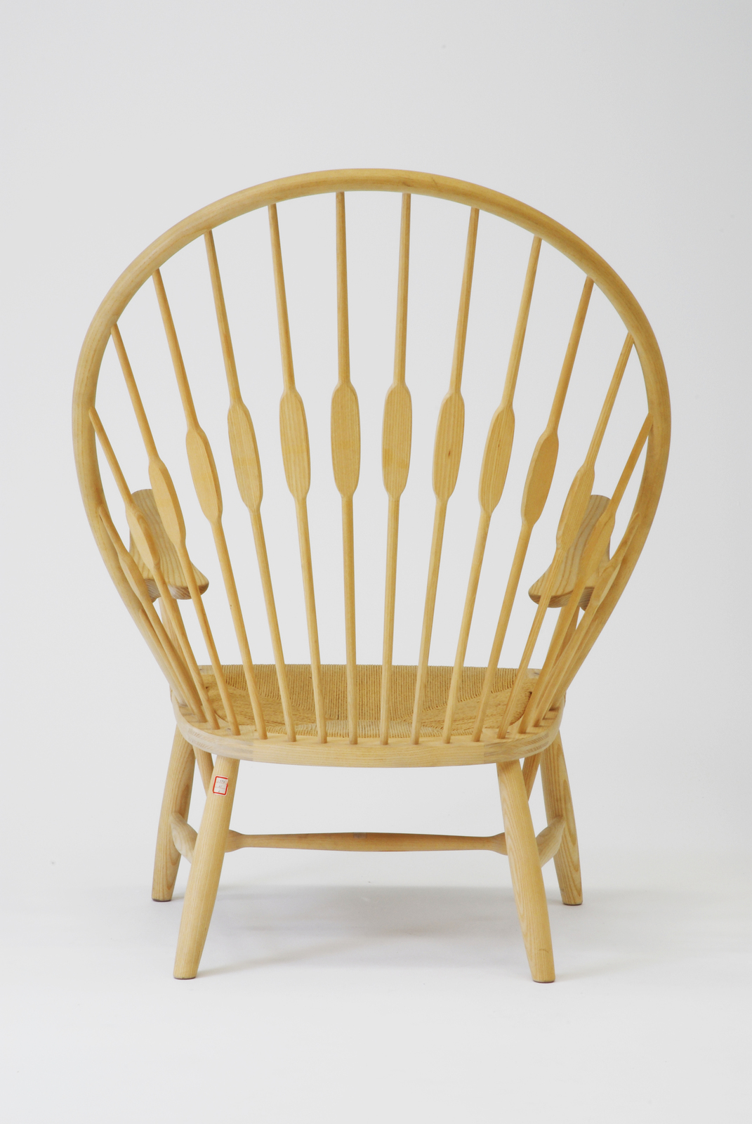 ウインザーチェアをデザインのモチーフとし、背の丸棒の中央に平らな部分をつくり、その名のとおり孔雀の羽根を広げたようなフォルムを持った椅子である。ピーコックという名は、ハンス・ウェグナーの友人であったフィン・ユールがつけた。また背のスポークが弓矢の形に似ていることから「アローチェア」とも呼ばれる。材料にトネリコを使用し、漂白し、無公害のソープフィニッシュ仕上げでよりいっそう軽さを出している。座はペーパーコードで編み、アームに汚れが目立たないようにチーク材を使って木の色のコントラストを出しているタイプもある。背の外周は当初成形合板であったが、現在は曲木でつくられている。 |
