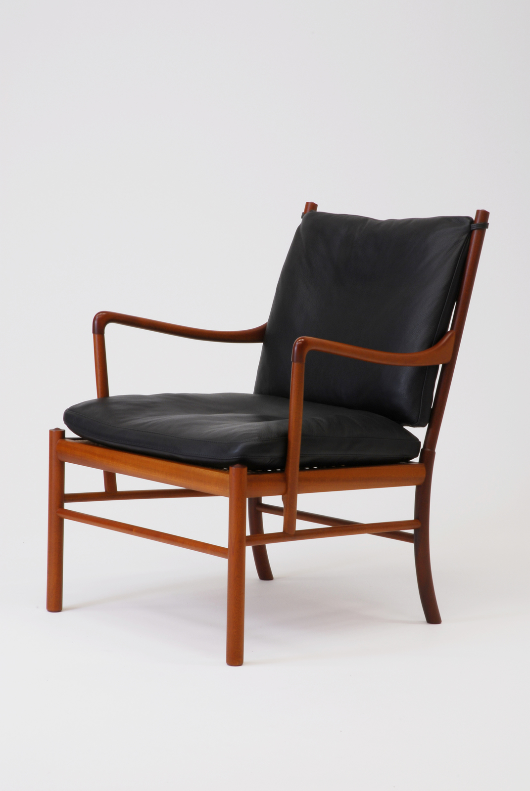 オーレ・ワンシャはコーレ・クリントの愛弟子として世界の家具の古典に精通したデザイナーであり、学者であった。彼はエジプトの家具にも精通し、それらの要素を今日的にリデザインし、デンマークの近代デザインの中に古典と近代を結ぶ系譜をつくり上げている。現在はP.J.ファニチャーで主として桜材で製造されているが、はじめは伝統的技術を持つA.Jイヴァーセンでつくられていた。デザインはマホガニー、ローズウッド、チーク等の硬木を使い、細身の中に微妙な曲面を含めた部材を組み合わせている、いわば大人のデザインという味がある。この椅子は革張りの背と座のクッションをフレームの上に乗せたものだが、クッションの中身の羽毛が座り心地と共に品格を加えている。