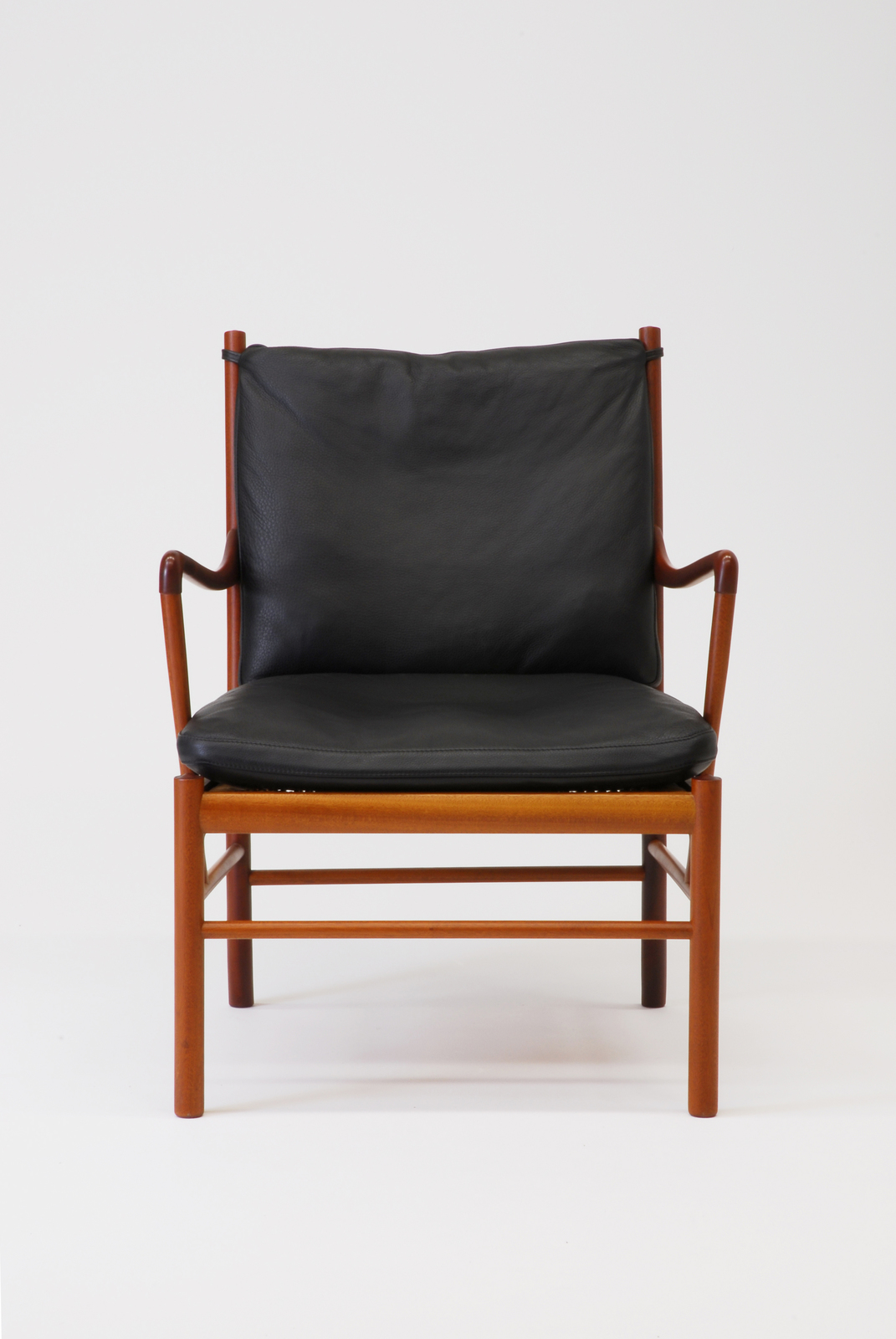 オーレ・ワンシャはコーレ・クリントの愛弟子として世界の家具の古典に精通したデザイナーであり、学者であった。彼はエジプトの家具にも精通し、それらの要素を今日的にリデザインし、デンマークの近代デザインの中に古典と近代を結ぶ系譜をつくり上げている。現在はP.J.ファニチャーで主として桜材で製造されているが、はじめは伝統的技術を持つA.Jイヴァーセンでつくられていた。デザインはマホガニー、ローズウッド、チーク等の硬木を使い、細身の中に微妙な曲面を含めた部材を組み合わせている、いわば大人のデザインという味がある。この椅子は革張りの背と座のクッションをフレームの上に乗せたものだが、クッションの中身の羽毛が座り心地と共に品格を加えている。
