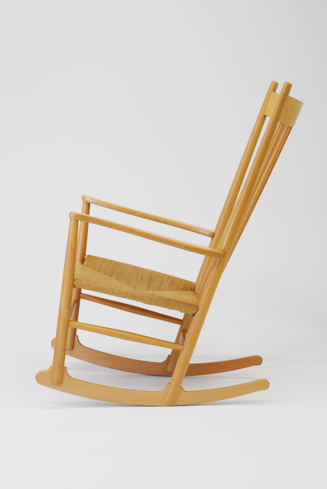 ハンス・ウェグナーが自分の作風を模索していた時代である1944年の作品。当時親友ボーエ・モーエンセンは所属するF.D.B.の工場でシェーカー家具の影響を受けて「シェーカーチェア J39」のデザインをした。ウェグナーもモーエンセンの「J39」ルーツである「シェーカー」に関心を持ちこの椅子をデザインしたと思われる。ハイバックの縦方向に並列するスポークの背とペーパーコードで編まれた座による最小限の構造ながら十分な強度であるところや、前後の脚がロッキングのスライドにまたがるように乗った構造など、シェーカーを今日的にリデザインした秀作である。