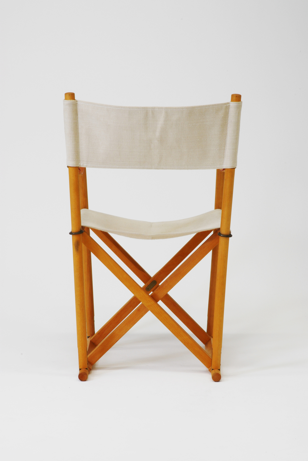 座面の四隅にあるリングが前脚と後脚に沿って上下して折り畳まれる椅子である。特徴的な構造は左右脚をつなぐX状のステーの先端にあるリングが折りたたまれるに従って回転するようになっていて、極めて独創的な折り畳み構造である。折り畳んだ椅子はコンパクトに納まり、軽くて持ち運びやすくなっている。また折り畳んだ姿で自立もできる。1932年のコペンハーゲン家具職人組合による「小住宅のための家具」コンペで一等に入選した。当時としてはあまりにも画期的な構造のため商品化されなかったが、1960年にデンマークのインテルナ社で製造され、今日ではルド・ラスムッセン社でつくられている。 |