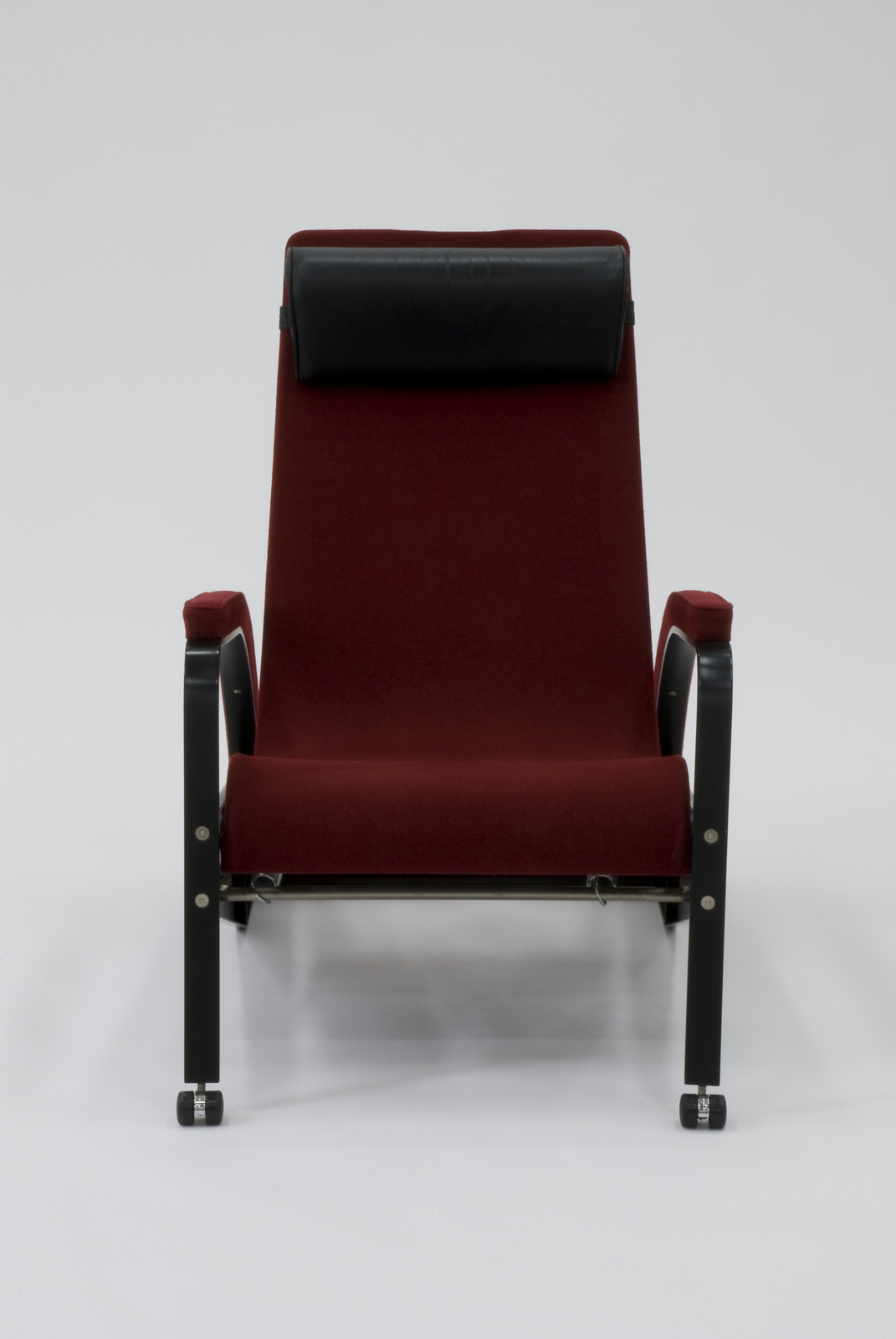一般的にリクライニングチェアとは背の角度が変わるが、この椅子は座面が後方にスライドすることで下の方へ行き、リクライニングチェアと同じような効果が得られる。座面裏に前後2カ所車軸がついており、座面を下げる場合には、足と手の踏ん張りによって下げ、起きあがるとスプリングによって、また元に戻るという仕組みになっている。前脚部にキャスターが付いているので、後脚を持ち上げると移動がしやすい。フレーム脚部の延長線が大きなカーブを描き、それがアームになっていて、そこをウレタン下地の布で覆いが取り付けられている。建築の鉄骨構造の専門家らしいジャン・プルーヴェによるデザインで、彼の椅子への考え方は多くの椅子デザイナーに影響を与えている。