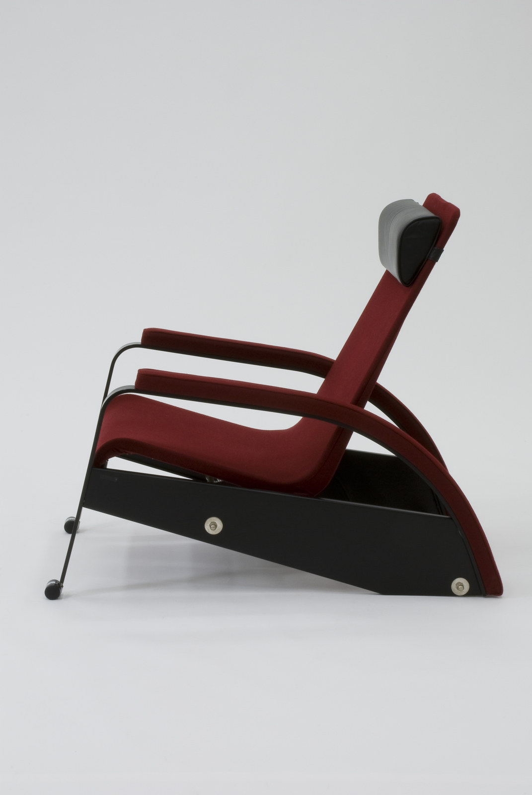 一般的にリクライニングチェアとは背の角度が変わるが、この椅子は座面が後方にスライドすることで下の方へ行き、リクライニングチェアと同じような効果が得られる。座面裏に前後2カ所車軸がついており、座面を下げる場合には、足と手の踏ん張りによって下げ、起きあがるとスプリングによって、また元に戻るという仕組みになっている。前脚部にキャスターが付いているので、後脚を持ち上げると移動がしやすい。フレーム脚部の延長線が大きなカーブを描き、それがアームになっていて、そこをウレタン下地の布で覆いが取り付けられている。建築の鉄骨構造の専門家らしいジャン・プルーヴェによるデザインで、彼の椅子への考え方は多くの椅子デザイナーに影響を与えている。