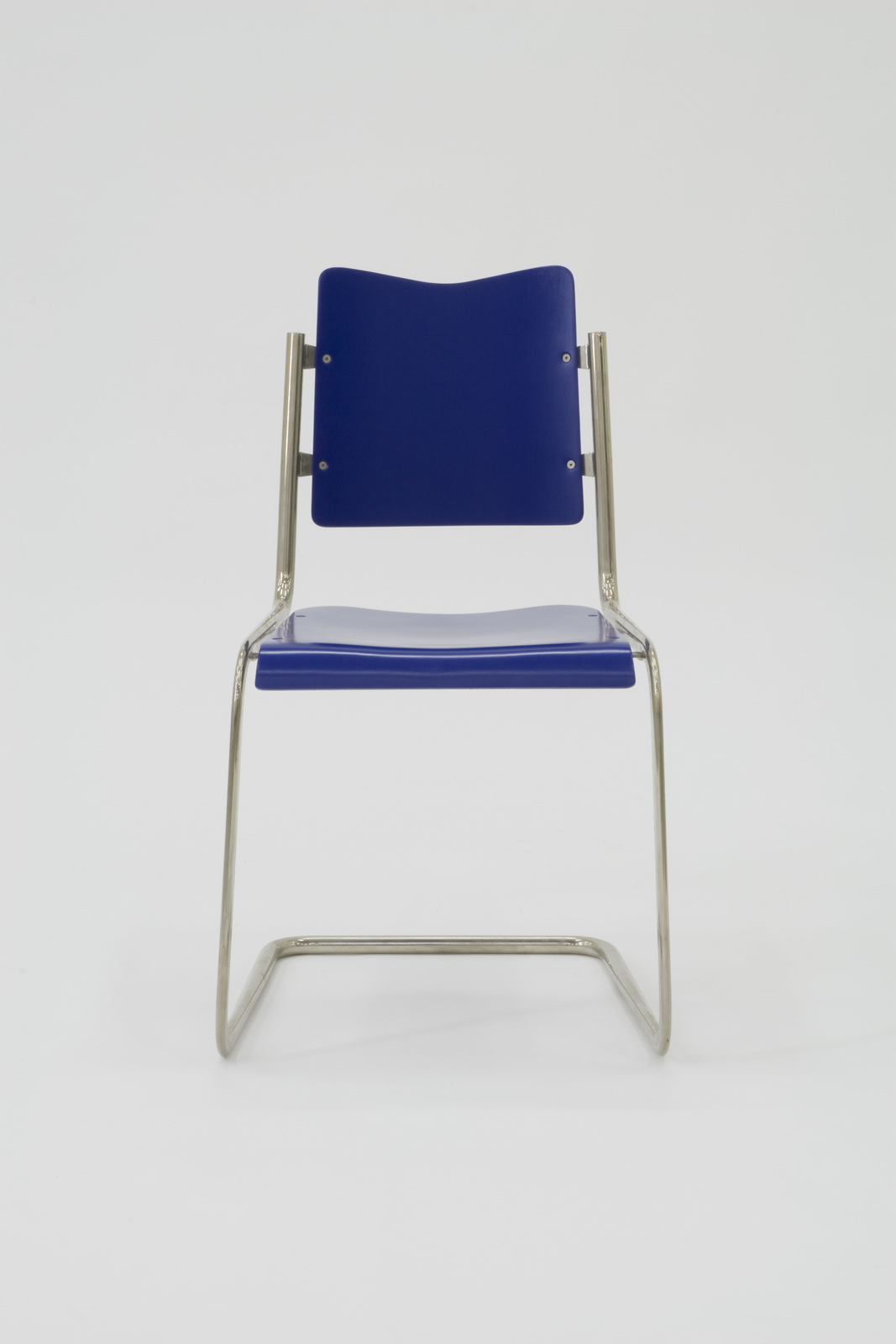 片持ち構造のスタッキングチェアである。フレームの主材はスチールパイプでできている。パイプの断面は背の部分では円形で、その状態のまま座面へ行き、さらに前脚の部分で楕円状になるが、単なる楕円ではなく中央部がへこんでいる形状になっている。楕円形状は続き、さらに後ろに廻るにしたがい再び元の円に変わってゆくという極めて複雑な構成をとっている。初号製造時に、このような技術が果たしてあったかどうかは疑問である。構造はパイプフレームの片持ち構造に成形合板の背と座があてがわれている。取付方法は、パイプフレームの左右に穴のあいたスチールのピースが付いており、それに背をあてがいビス止めという簡単な方法である。 |