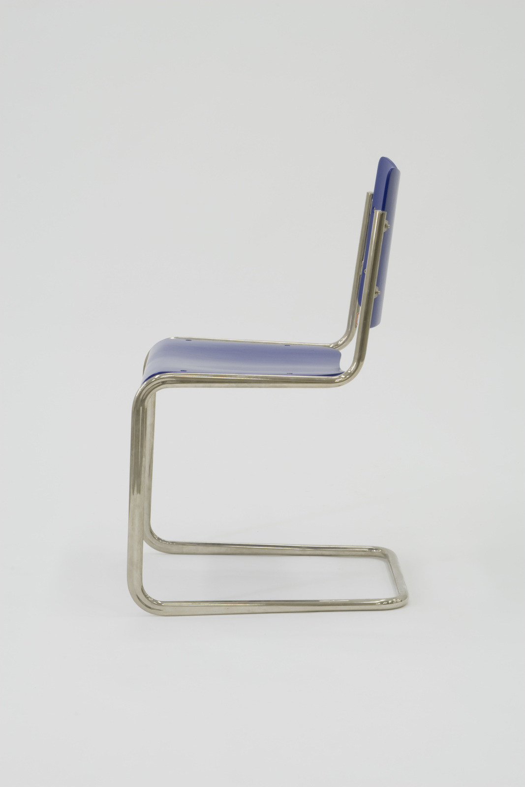 片持ち構造のスタッキングチェアである。フレームの主材はスチールパイプでできている。パイプの断面は背の部分では円形で、その状態のまま座面へ行き、さらに前脚の部分で楕円状になるが、単なる楕円ではなく中央部がへこんでいる形状になっている。楕円形状は続き、さらに後ろに廻るにしたがい再び元の円に変わってゆくという極めて複雑な構成をとっている。初号製造時に、このような技術が果たしてあったかどうかは疑問である。構造はパイプフレームの片持ち構造に成形合板の背と座があてがわれている。取付方法は、パイプフレームの左右に穴のあいたスチールのピースが付いており、それに背をあてがいビス止めという簡単な方法である。 |