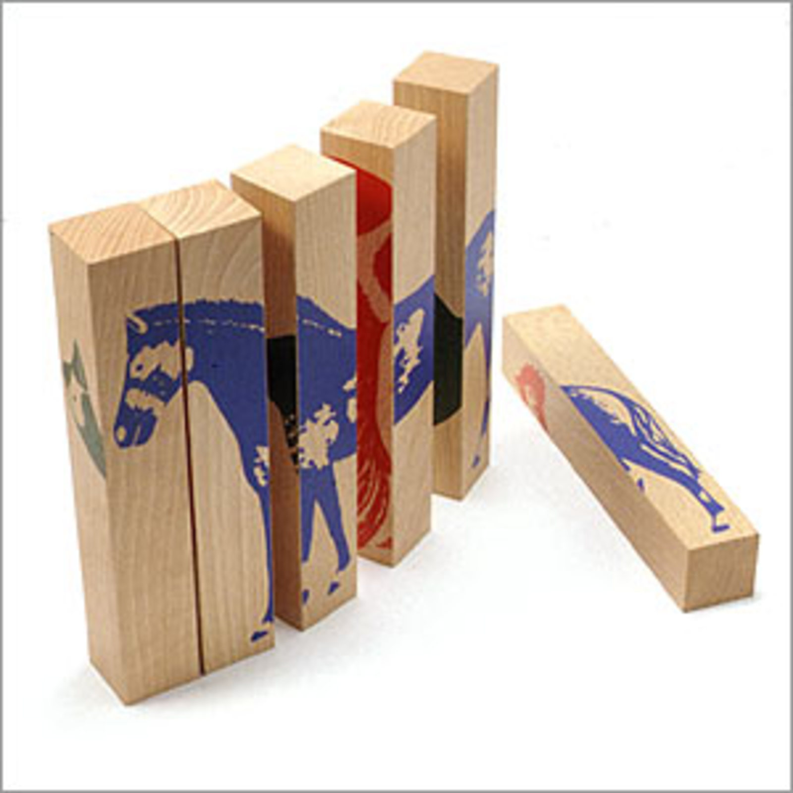 35mm角の積み木を使ったパターン遊び。4種類の動物(ウマ・イヌ・ニワトリ・カモ)ができる。適応年齢:3+