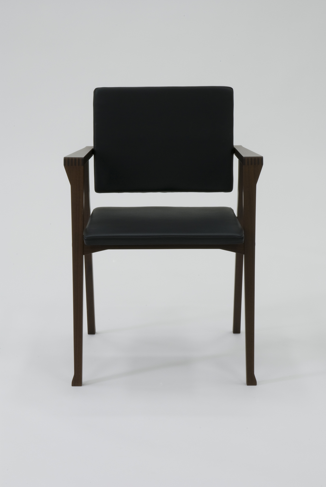 フレームの素材はウォールナットで、サイド部分の接合にボルトを使用し、中間の貫を止めている。この椅子の特色は各所に少しエラが張ったような部分がある点で、これには機能的な意味もあると思われる。例えば脚の先端にある接地面の部分は、安定性と関係がある。また後脚はアームと接する部分が太くなっており、アームと脚の接合面積を広くし、強度を高めている。アームと前脚の接合は、組み手によるもので意匠的にも美しく表現されている。座と背は木枠にウレタンをのせ、その上に革張りをしている。部分的な変化を持たせて全体の表情を豊かにしている作品である。フランコ・アルビニは優れた建築を幾つも設計した。この椅子の構造・フォルムにも彼の建築に通じる箇所がある。 |
