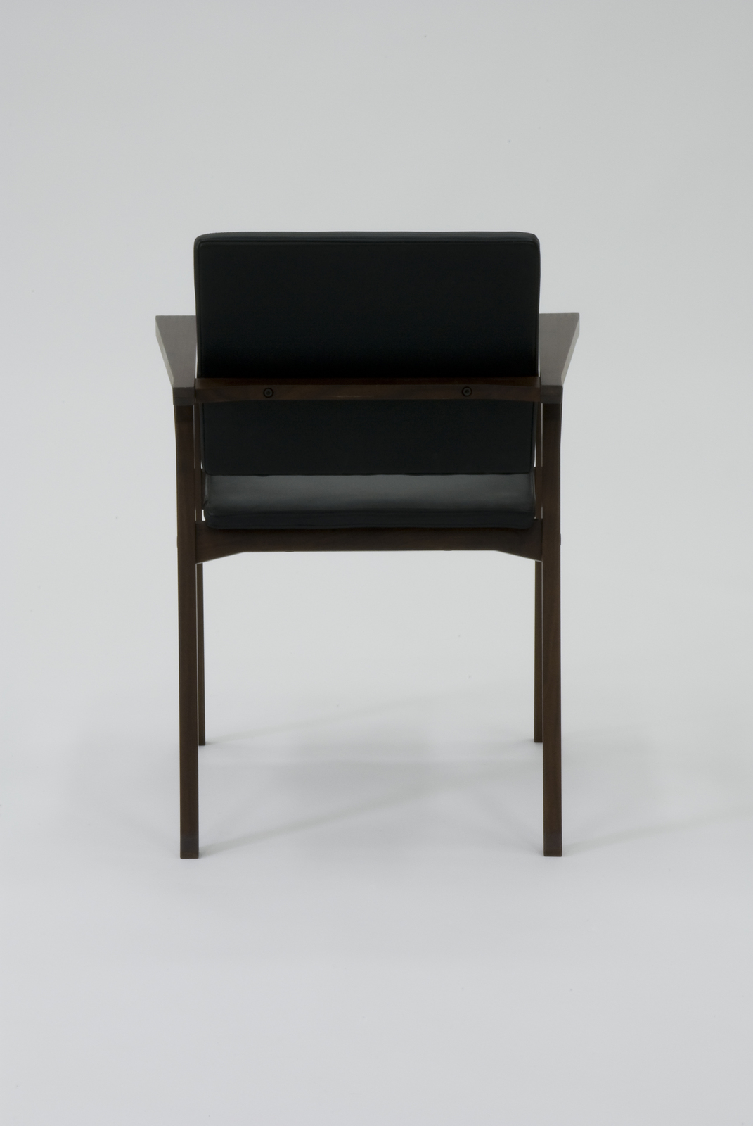 フレームの素材はウォールナットで、サイド部分の接合にボルトを使用し、中間の貫を止めている。この椅子の特色は各所に少しエラが張ったような部分がある点で、これには機能的な意味もあると思われる。例えば脚の先端にある接地面の部分は、安定性と関係がある。また後脚はアームと接する部分が太くなっており、アームと脚の接合面積を広くし、強度を高めている。アームと前脚の接合は、組み手によるもので意匠的にも美しく表現されている。座と背は木枠にウレタンをのせ、その上に革張りをしている。部分的な変化を持たせて全体の表情を豊かにしている作品である。フランコ・アルビニは優れた建築を幾つも設計した。この椅子の構造・フォルムにも彼の建築に通じる箇所がある。 |