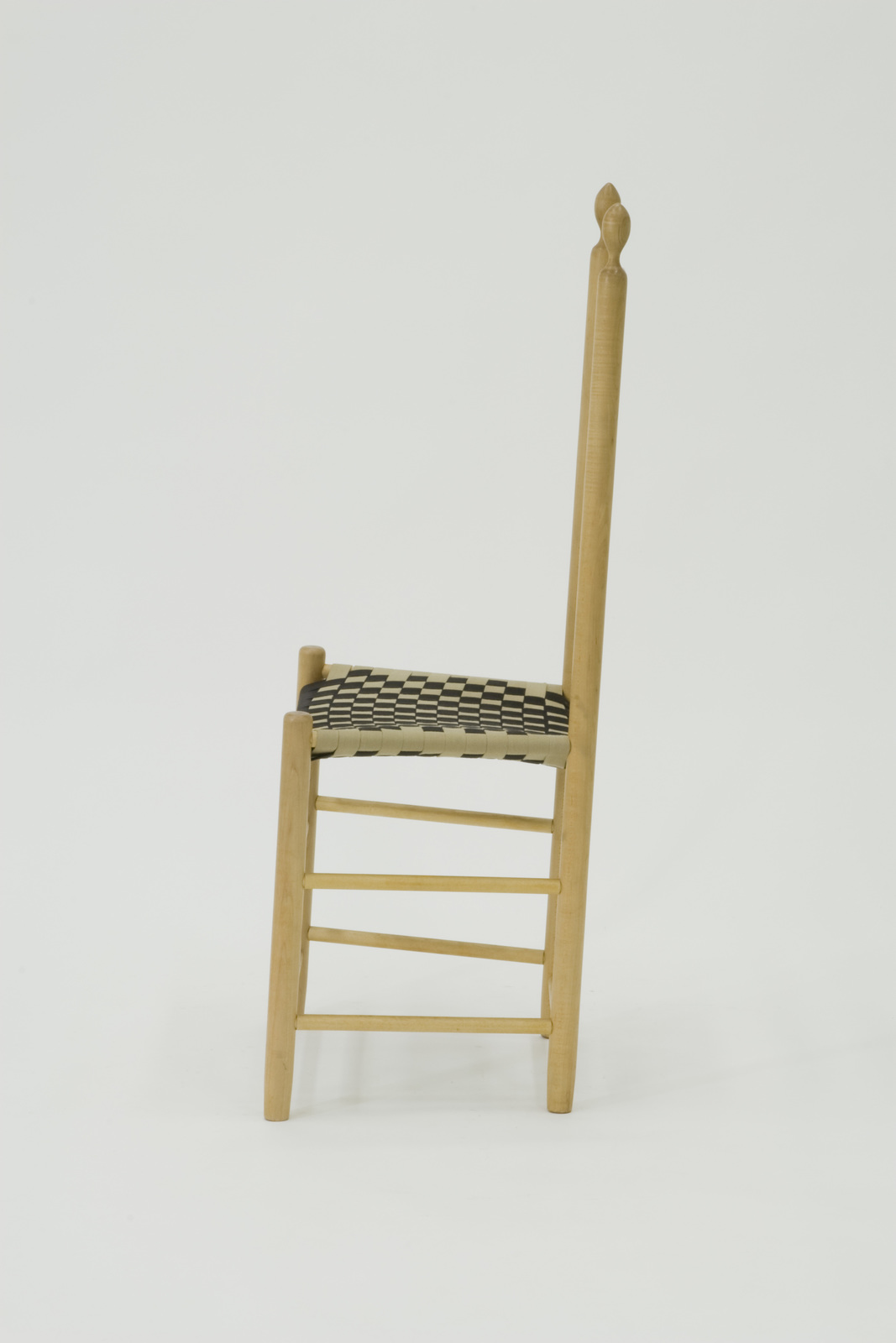 個人のためではなく、自分たちが所属する集団のために椅子を作るという目的から、自ずと手間がかからず、丈夫な椅子が生み出されることとなった。しかもシェーカー教徒が重んじた清貧という理念は、質を高めつつも虚飾を廃するという近代デザインの本質につながっていると言っていいだろう。私有財産が認められなかったシェーカーヴィレッジでは、そこで作られる家具はすべてが同じ形態で量産され、個人の趣向などはほとんど見られないのだが、座面を構成するテープの裏などの目立たない場所に作り手の名前が記されているものも見られる。 |