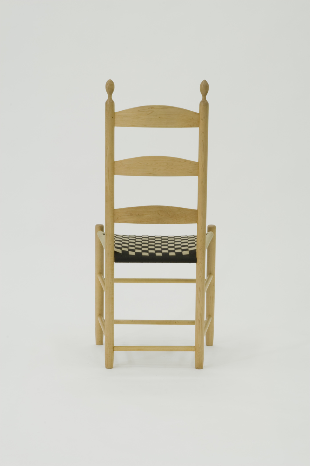 個人のためではなく、自分たちが所属する集団のために椅子を作るという目的から、自ずと手間がかからず、丈夫な椅子が生み出されることとなった。しかもシェーカー教徒が重んじた清貧という理念は、質を高めつつも虚飾を廃するという近代デザインの本質につながっていると言っていいだろう。私有財産が認められなかったシェーカーヴィレッジでは、そこで作られる家具はすべてが同じ形態で量産され、個人の趣向などはほとんど見られないのだが、座面を構成するテープの裏などの目立たない場所に作り手の名前が記されているものも見られる。
