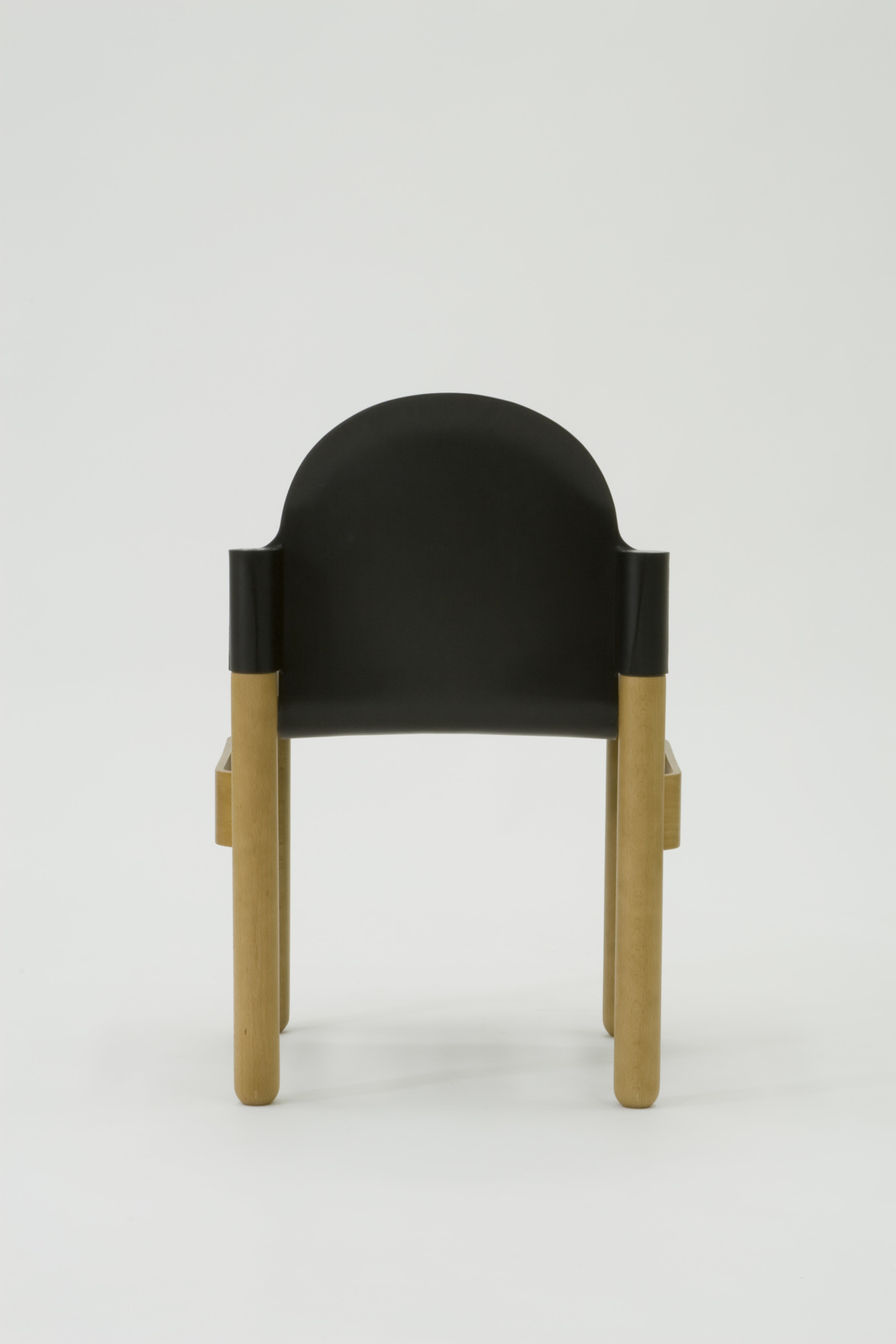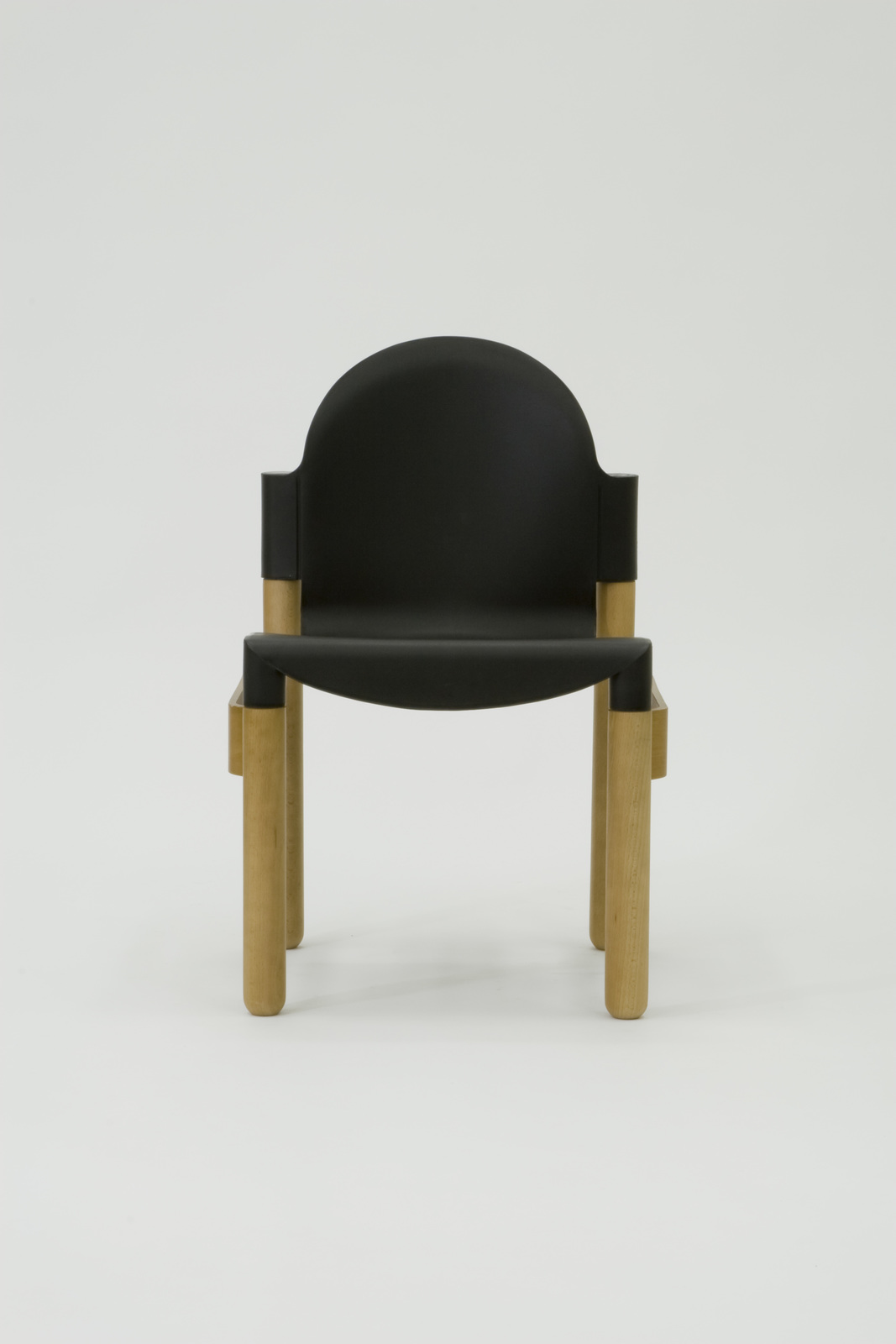 曲木家具の長い歴史を持つトーネット本社が、時代の要請を受け、ゲルト・ランゲによるデザインのポリプロピレンとブナの組合せによるシステム家具である。座から背の表面を梨地にすることで滑り止めを効かせ、脚との組立も特別な器材を使用せずにできるようになっている。連結やスタッキング機能も持っているので、家庭やオフィスだけでなく、ホールなどで大量に使用した場合に対応できるように、シートナンバーの取り付けにも対応できる。システム椅子として細部まで配慮が行き届いた椅子である。 |