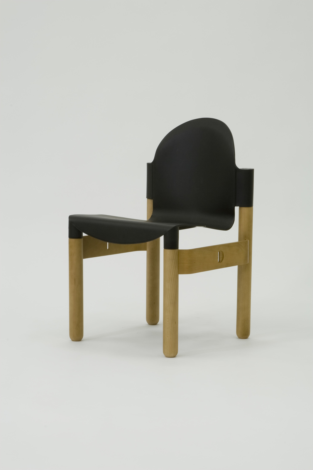 曲木家具の長い歴史を持つトーネット本社が、時代の要請を受け、ゲルト・ランゲによるデザインのポリプロピレンとブナの組合せによるシステム家具である。座から背の表面を梨地にすることで滑り止めを効かせ、脚との組立も特別な器材を使用せずにできるようになっている。連結やスタッキング機能も持っているので、家庭やオフィスだけでなく、ホールなどで大量に使用した場合に対応できるように、シートナンバーの取り付けにも対応できる。システム椅子として細部まで配慮が行き届いた椅子である。 |
